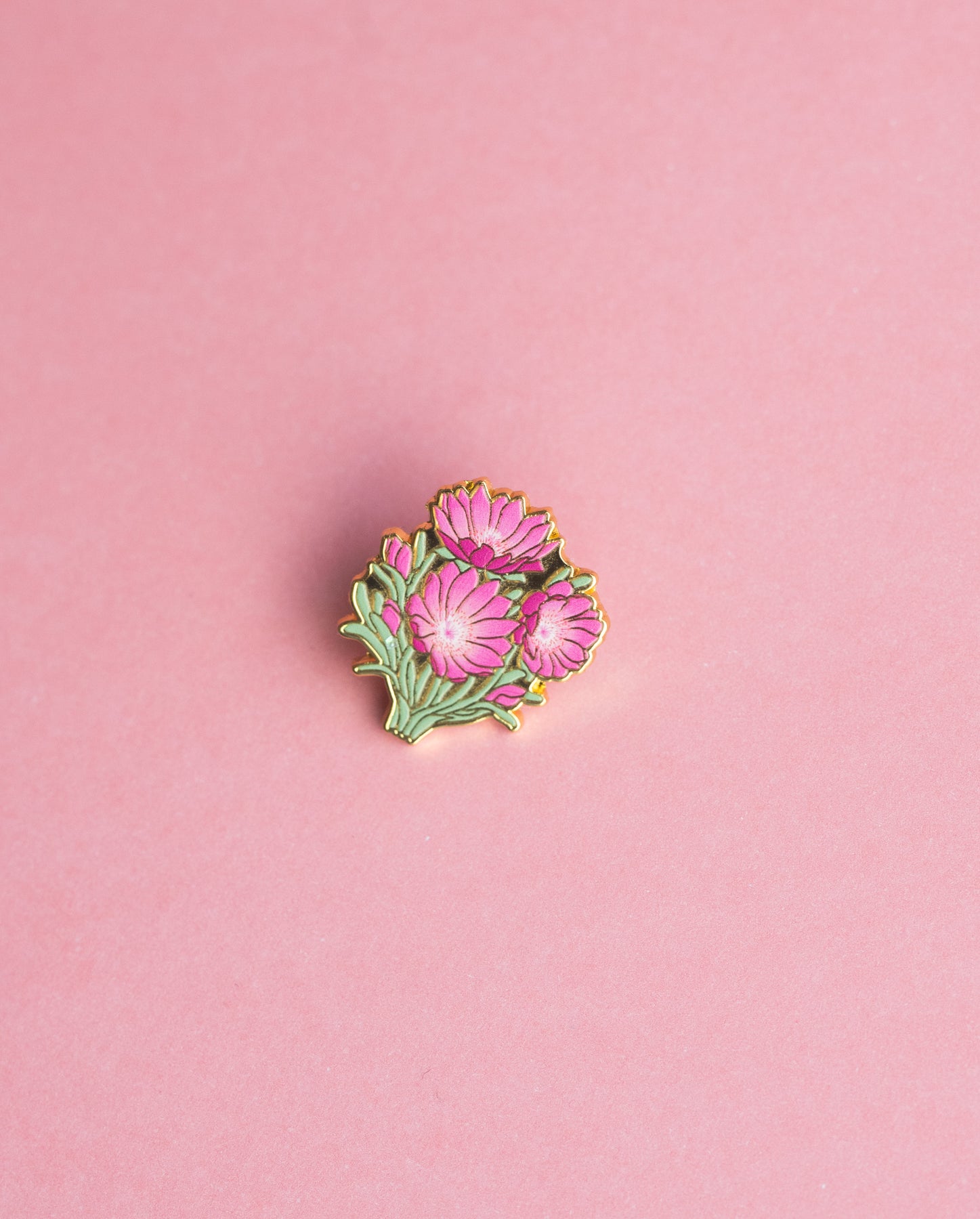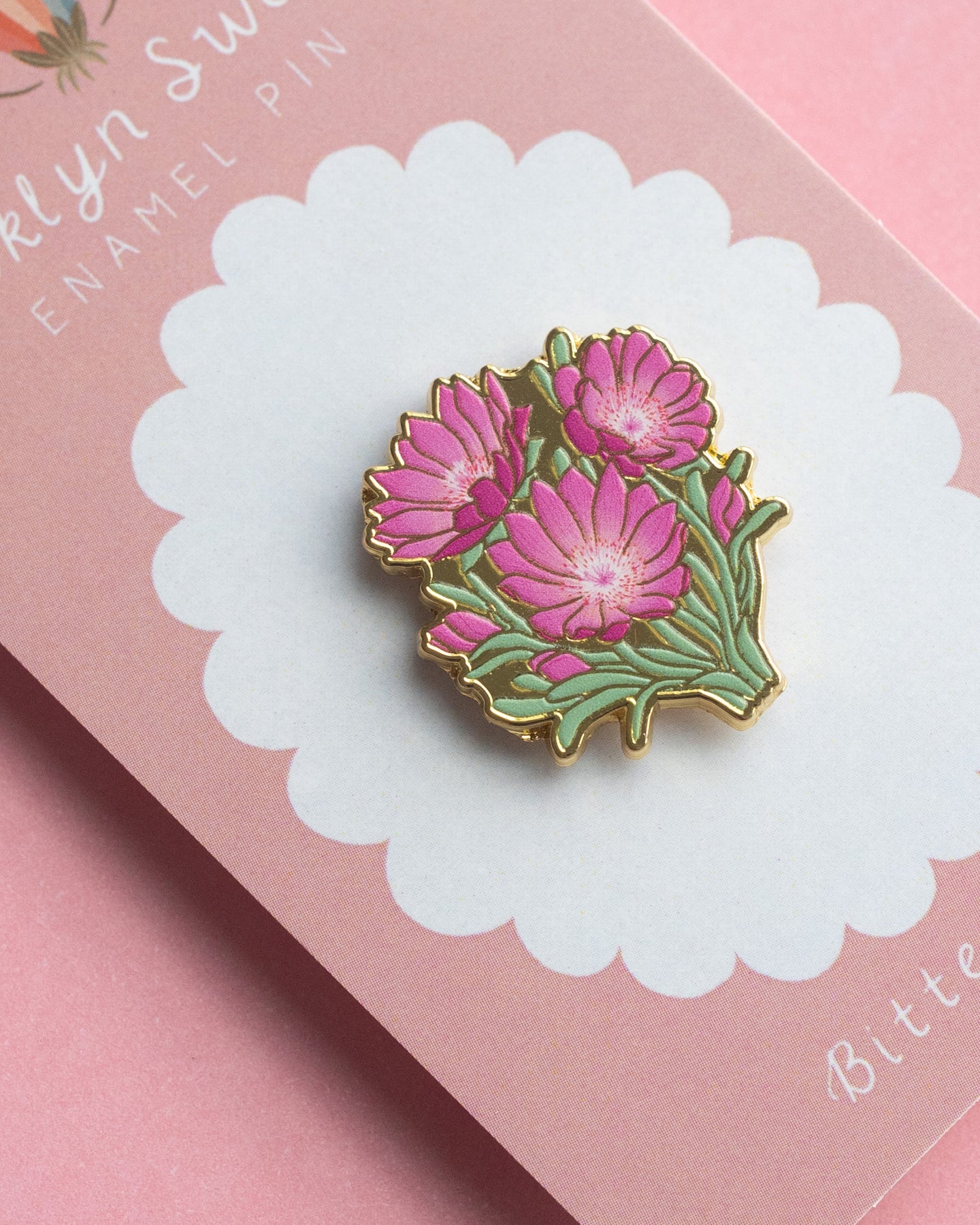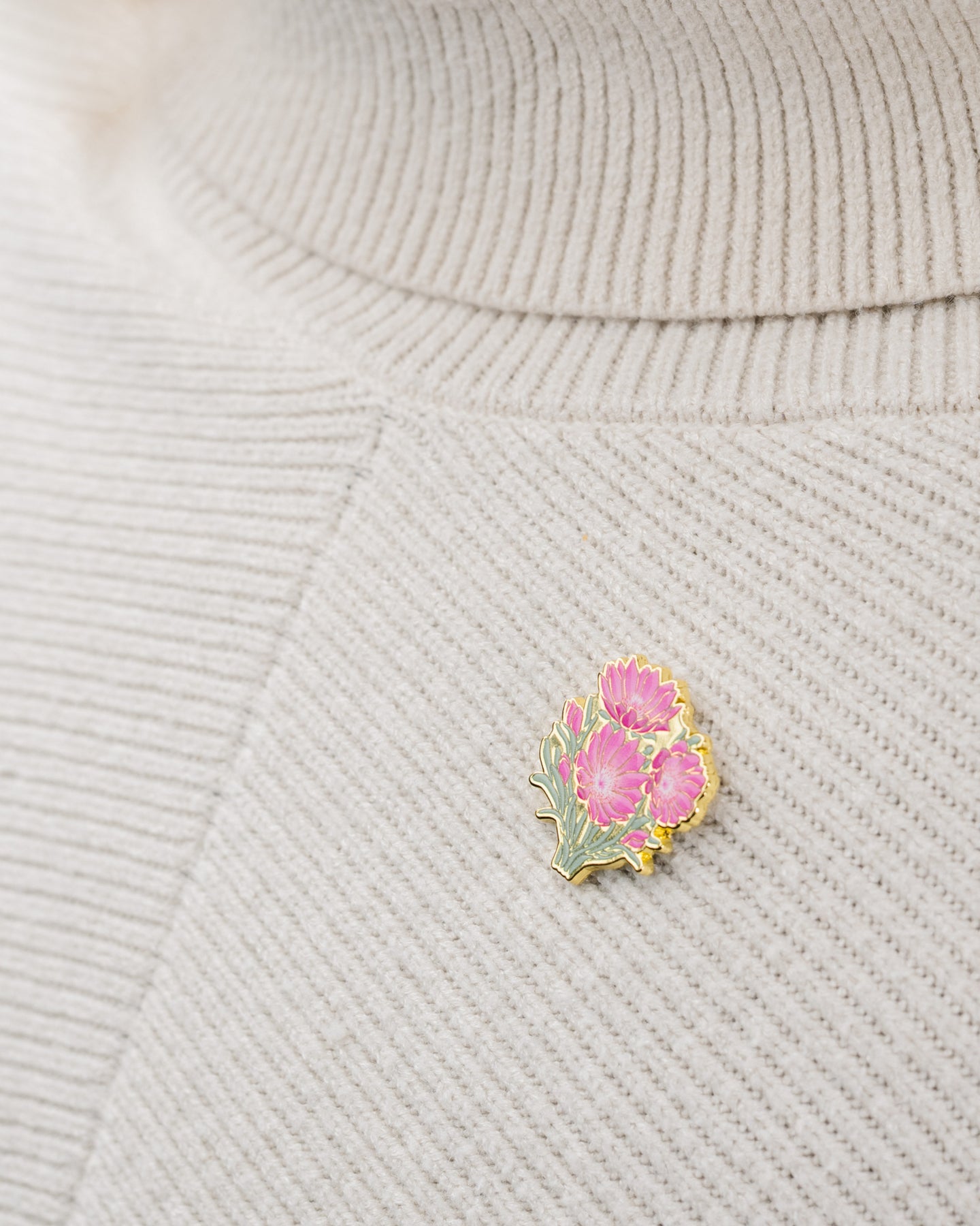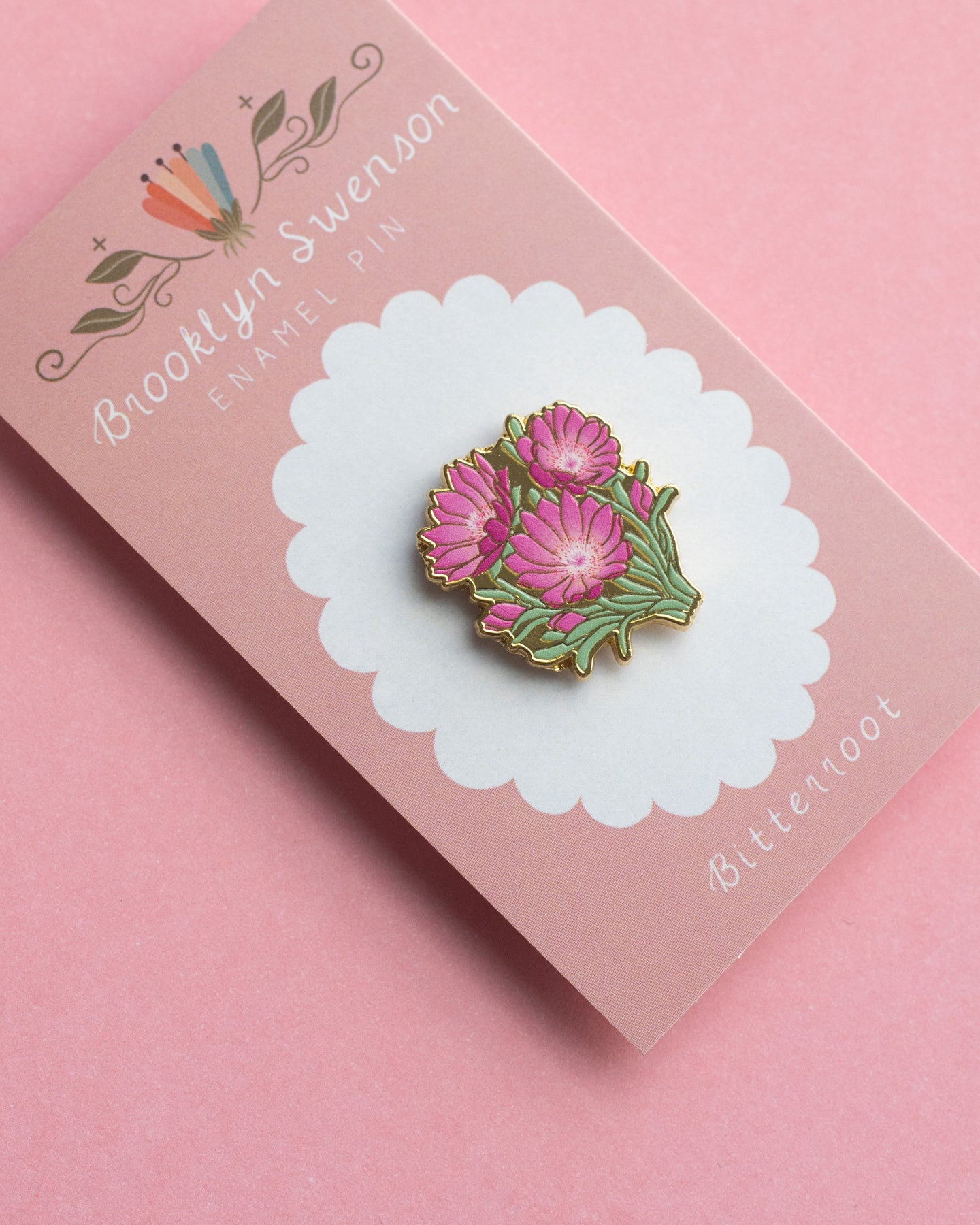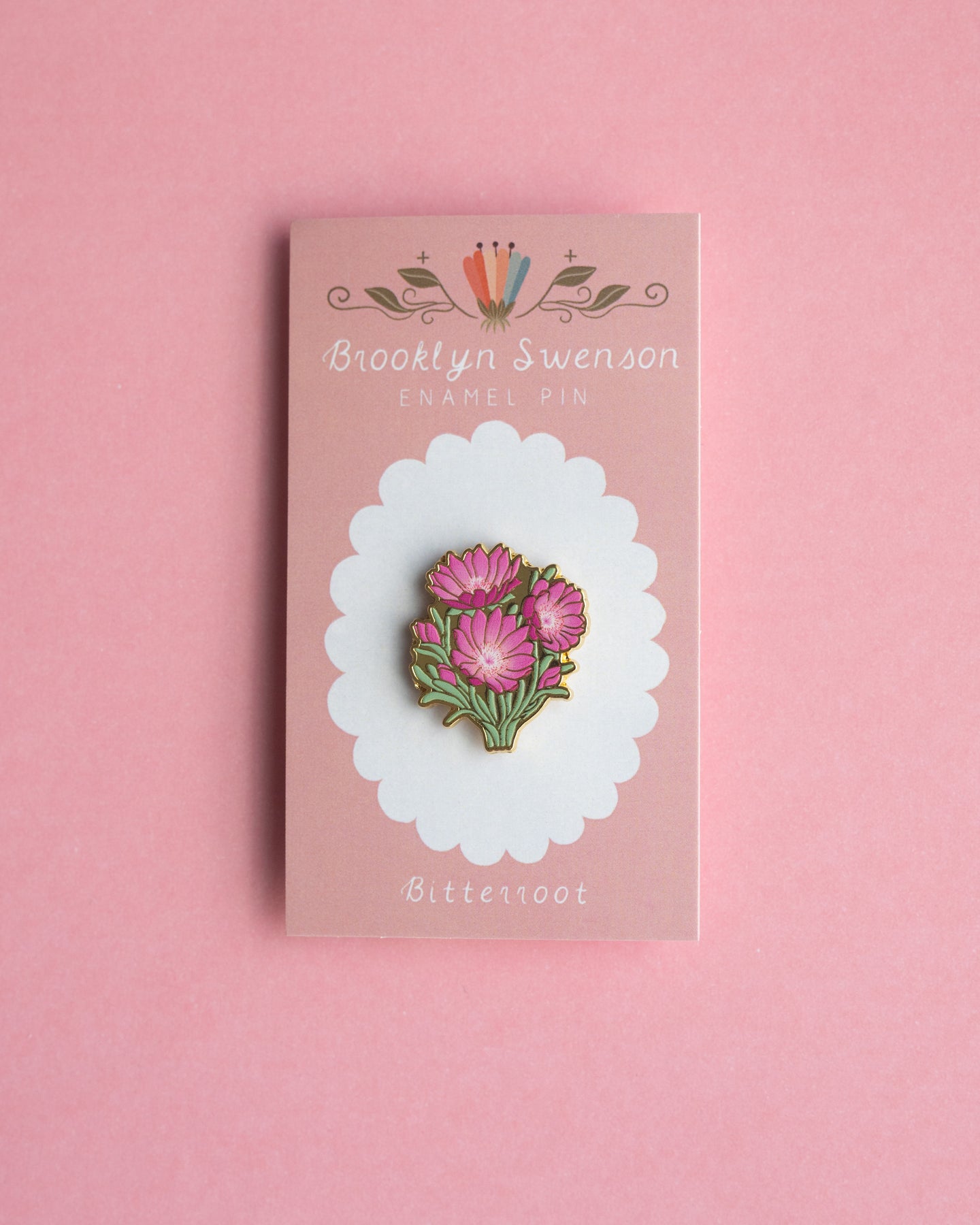 This is a detailed hard enamel pin made from my original “Bitterroot” gouache and watercolor painting. Features one pin post and a tight fitting rubber backing.