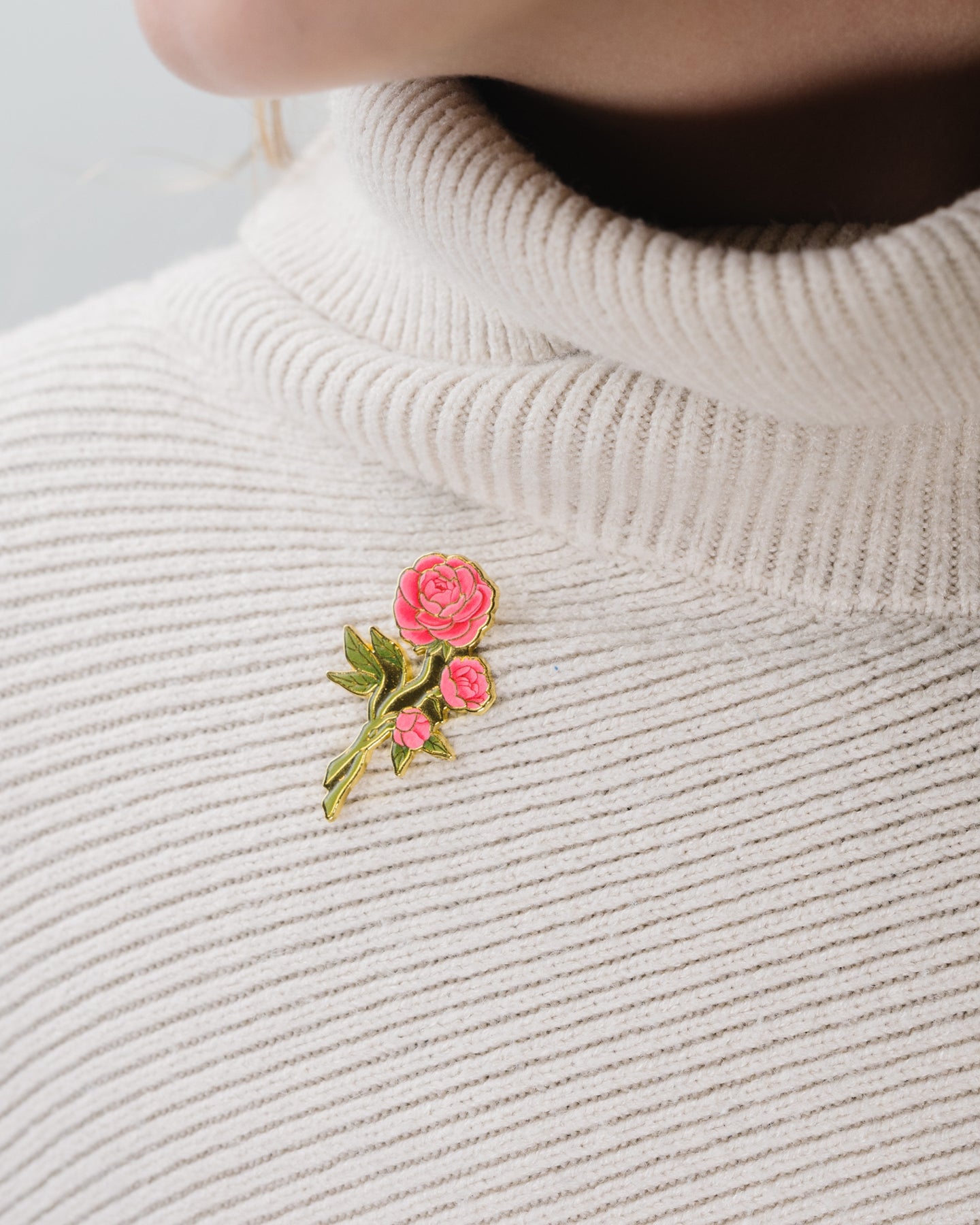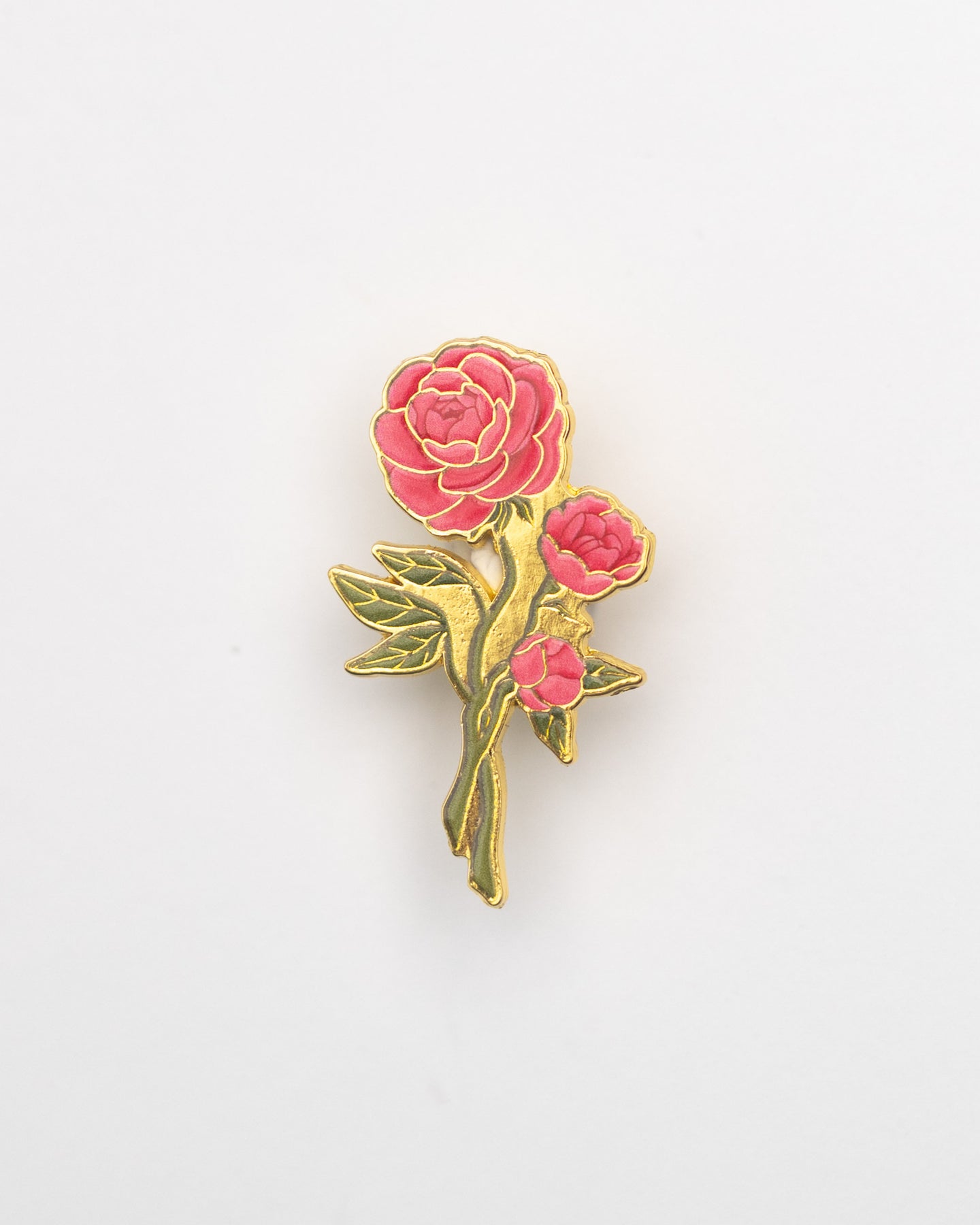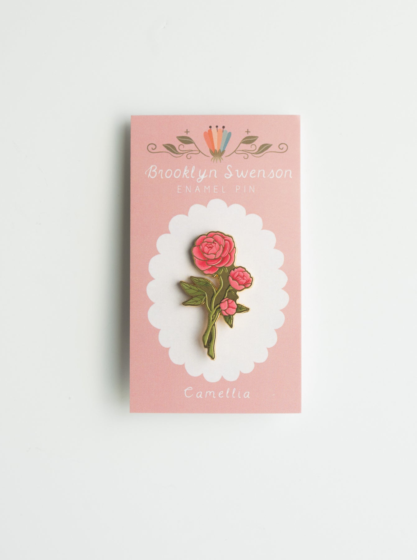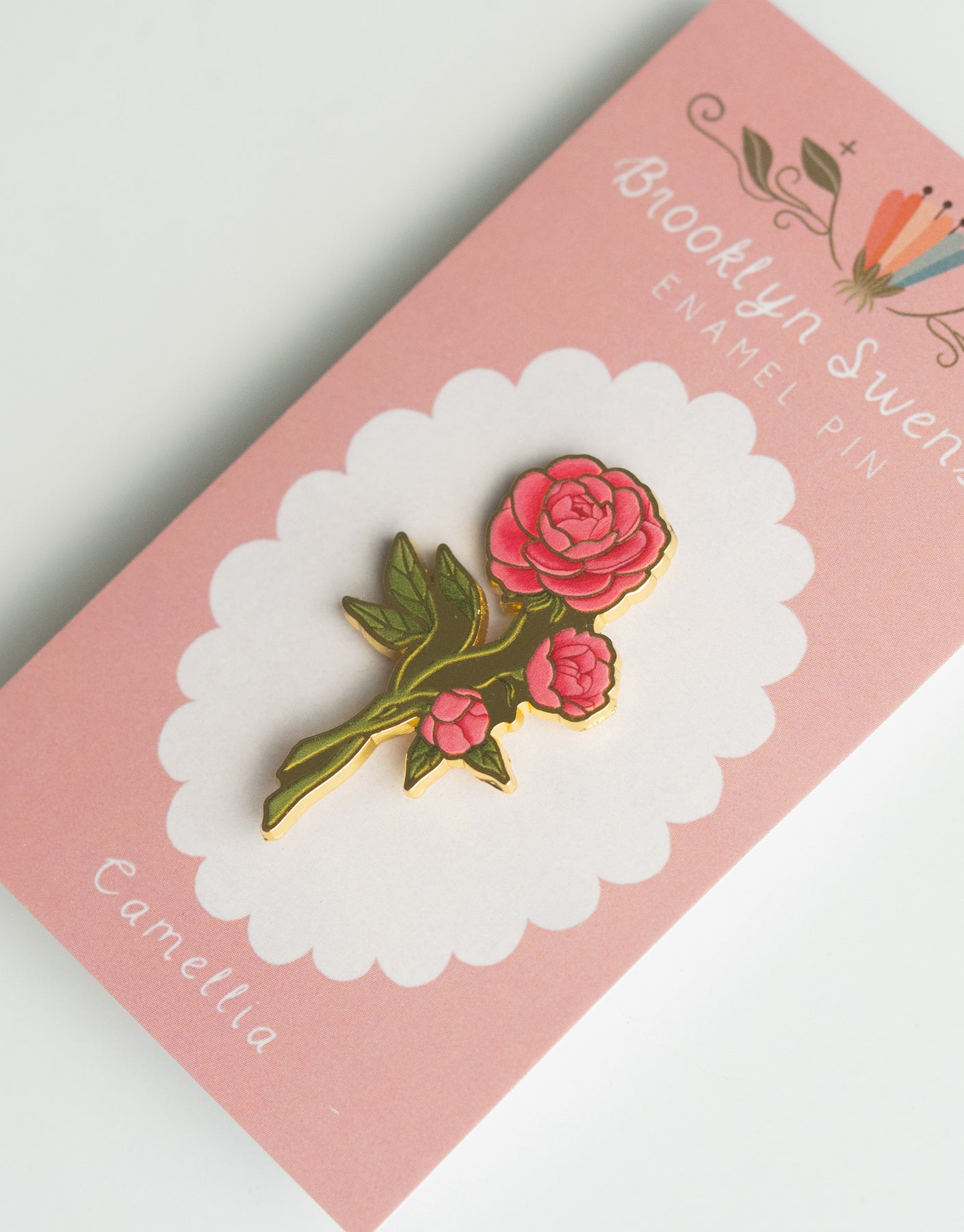 This is a detailed hard enamel pin made from my original “Camellia” gouache and watercolor painting. Features one pin post and a tight fitting rubber backing.