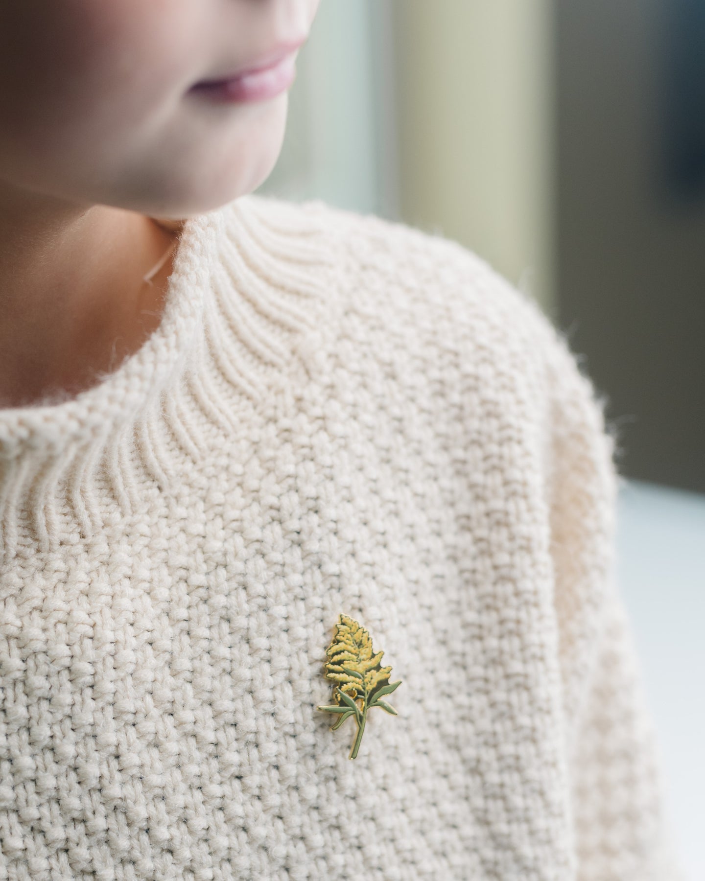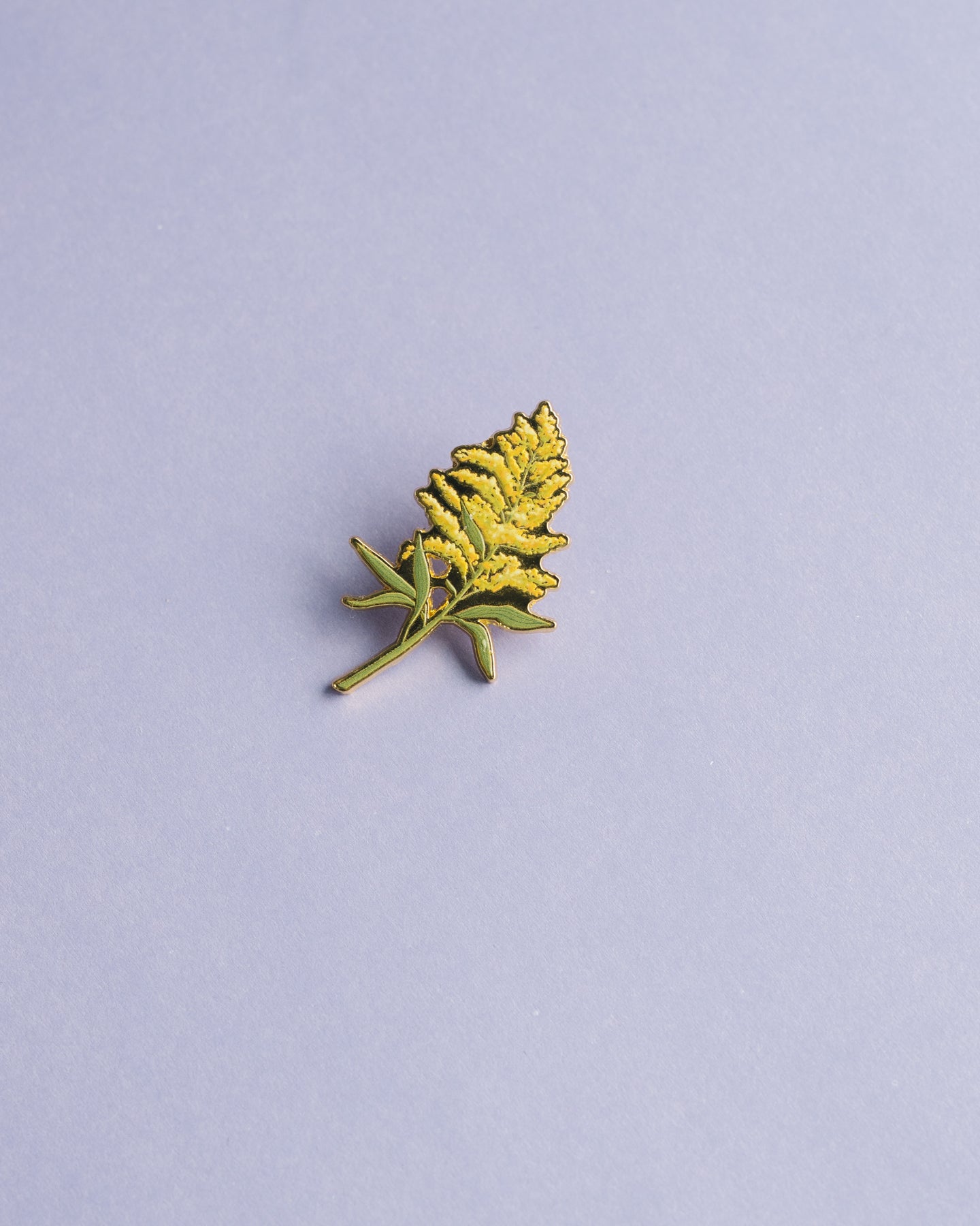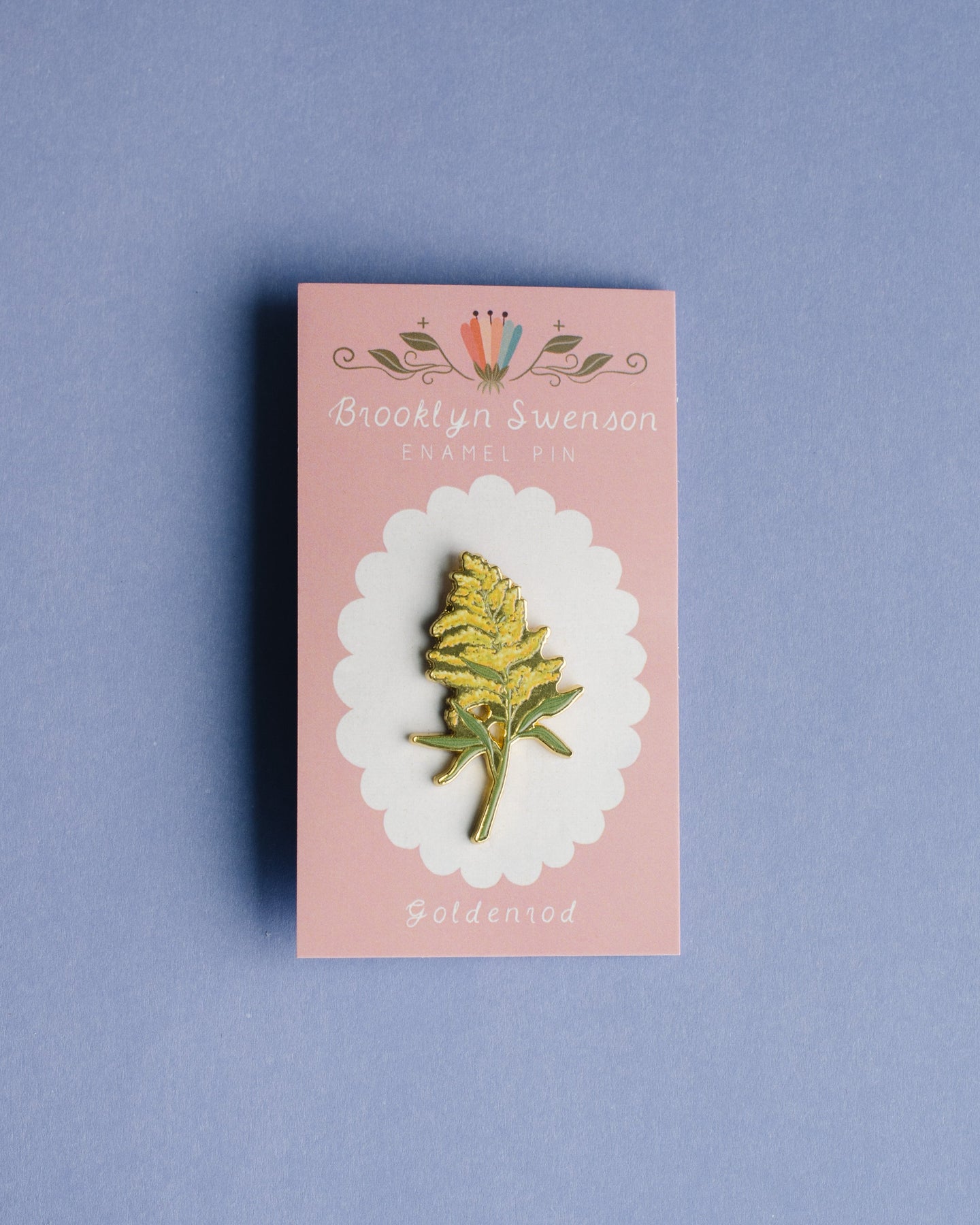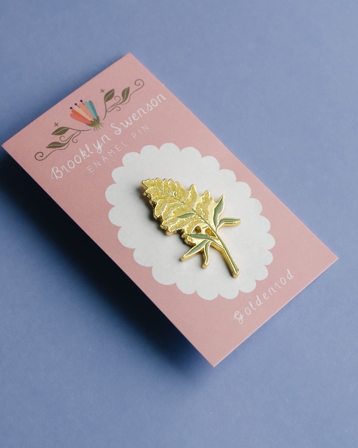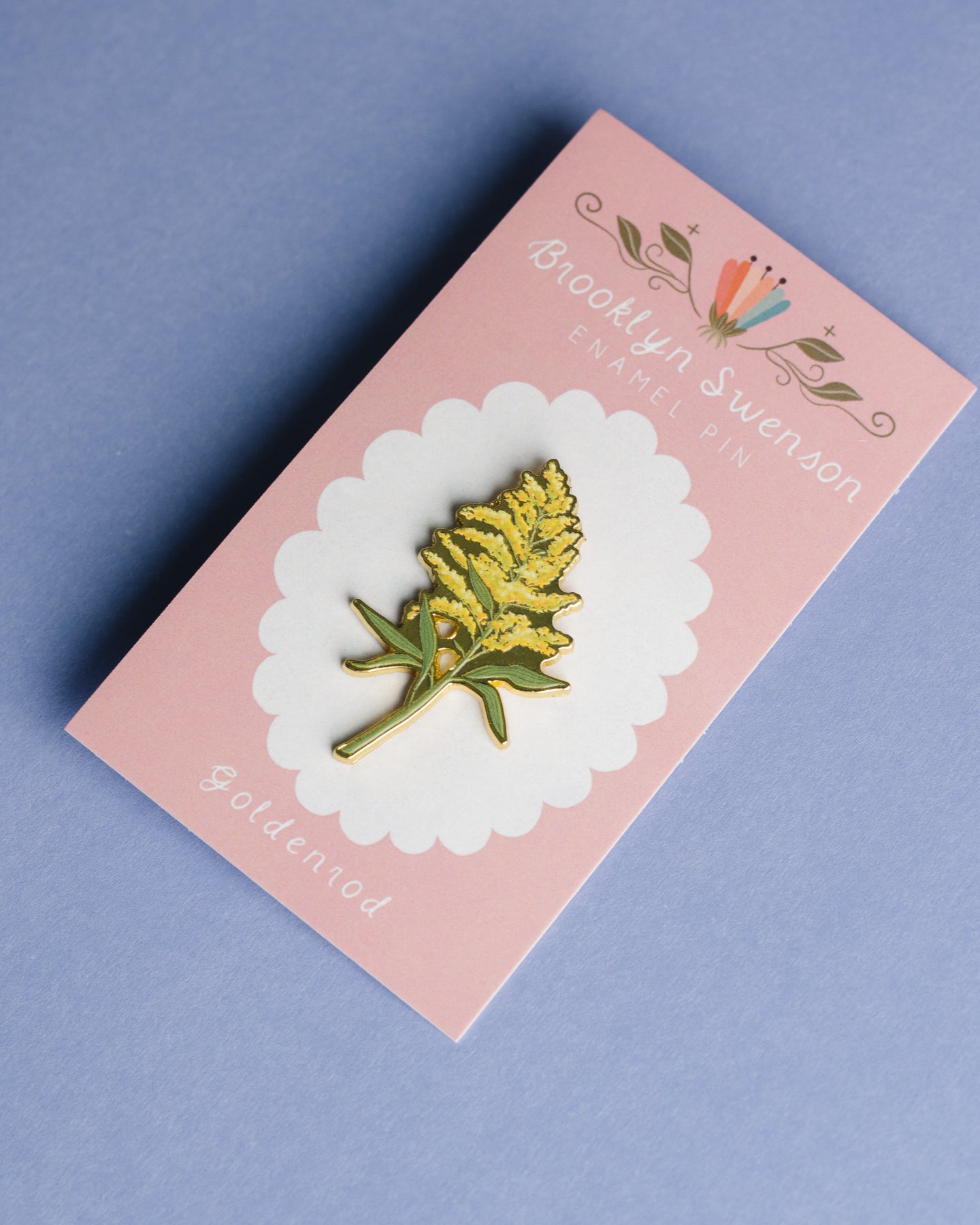 This is a detailed hard enamel pin made from my original “Goldenrod” gouache and watercolor painting. Features one pin post and a tight fitting rubber backing.