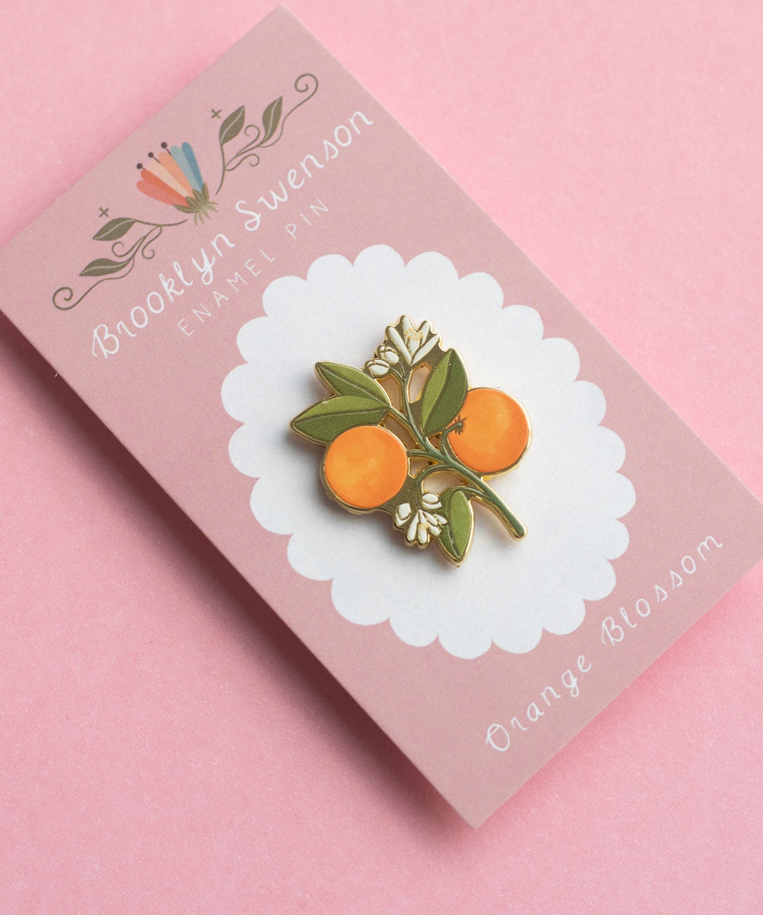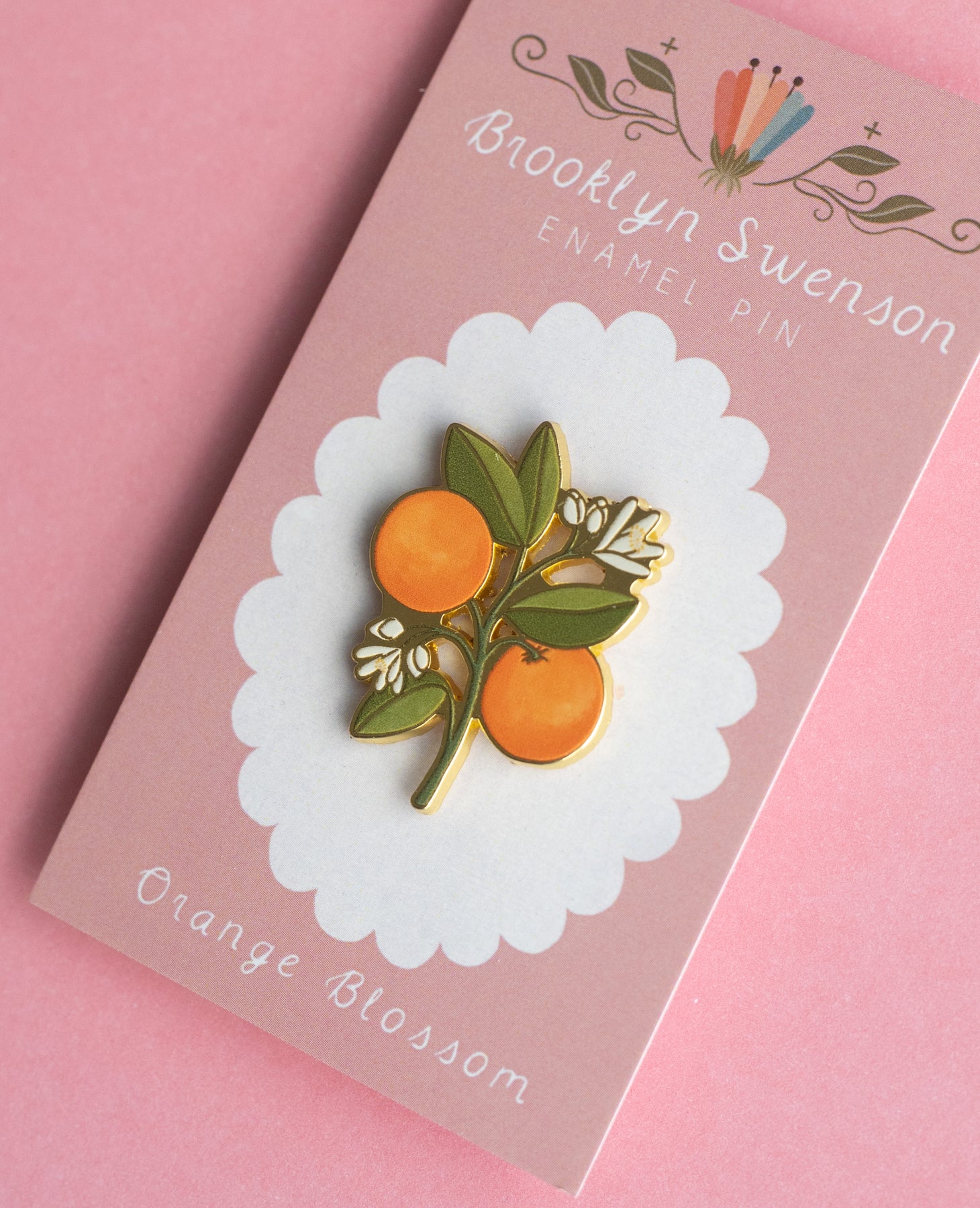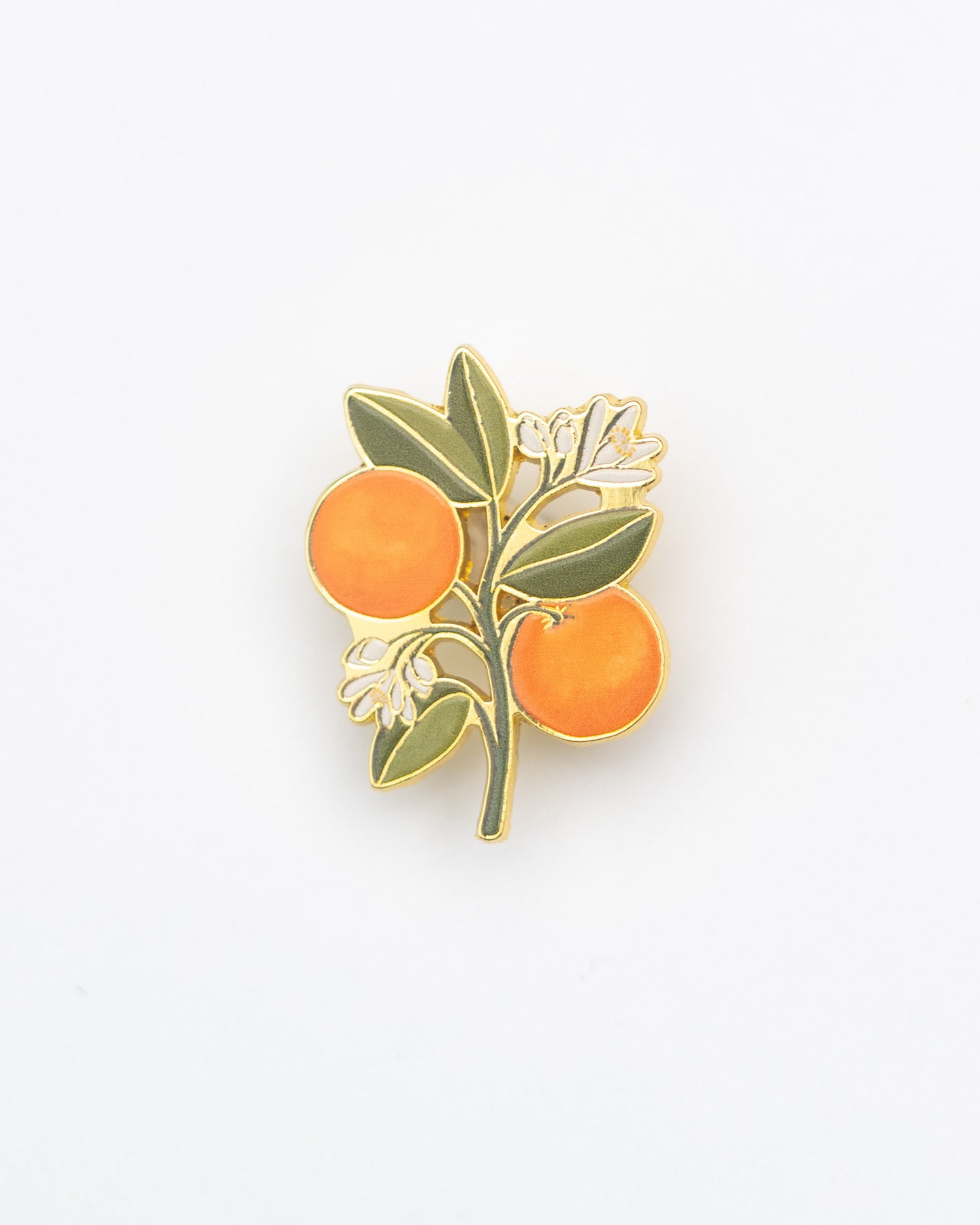 This is a detailed hard enamel pin made from my original “Orange Blossom” gouache and watercolor painting. Features one pin post and a tight fitting rubber backing.