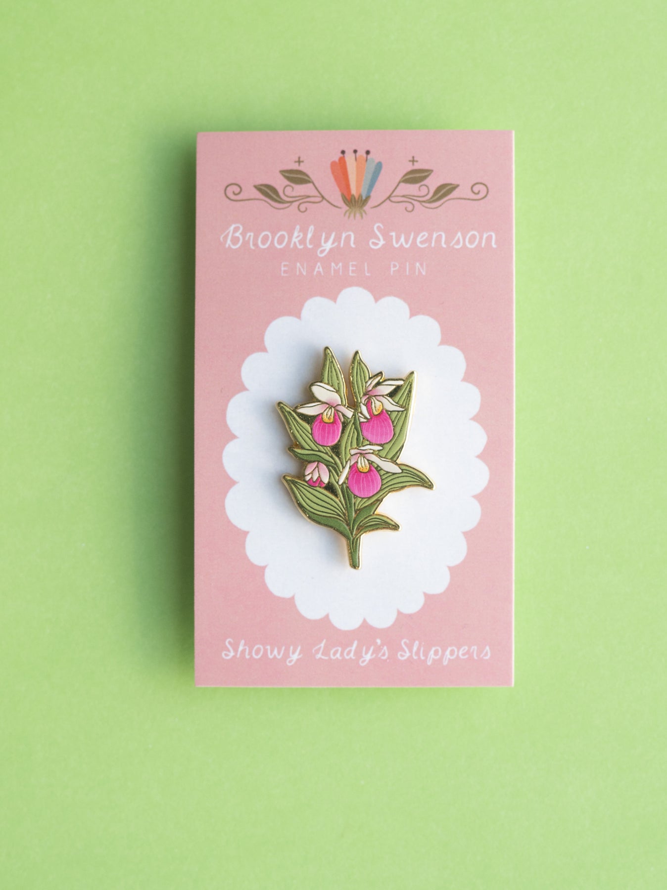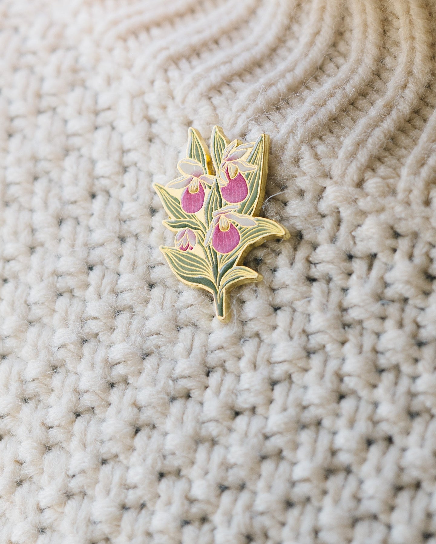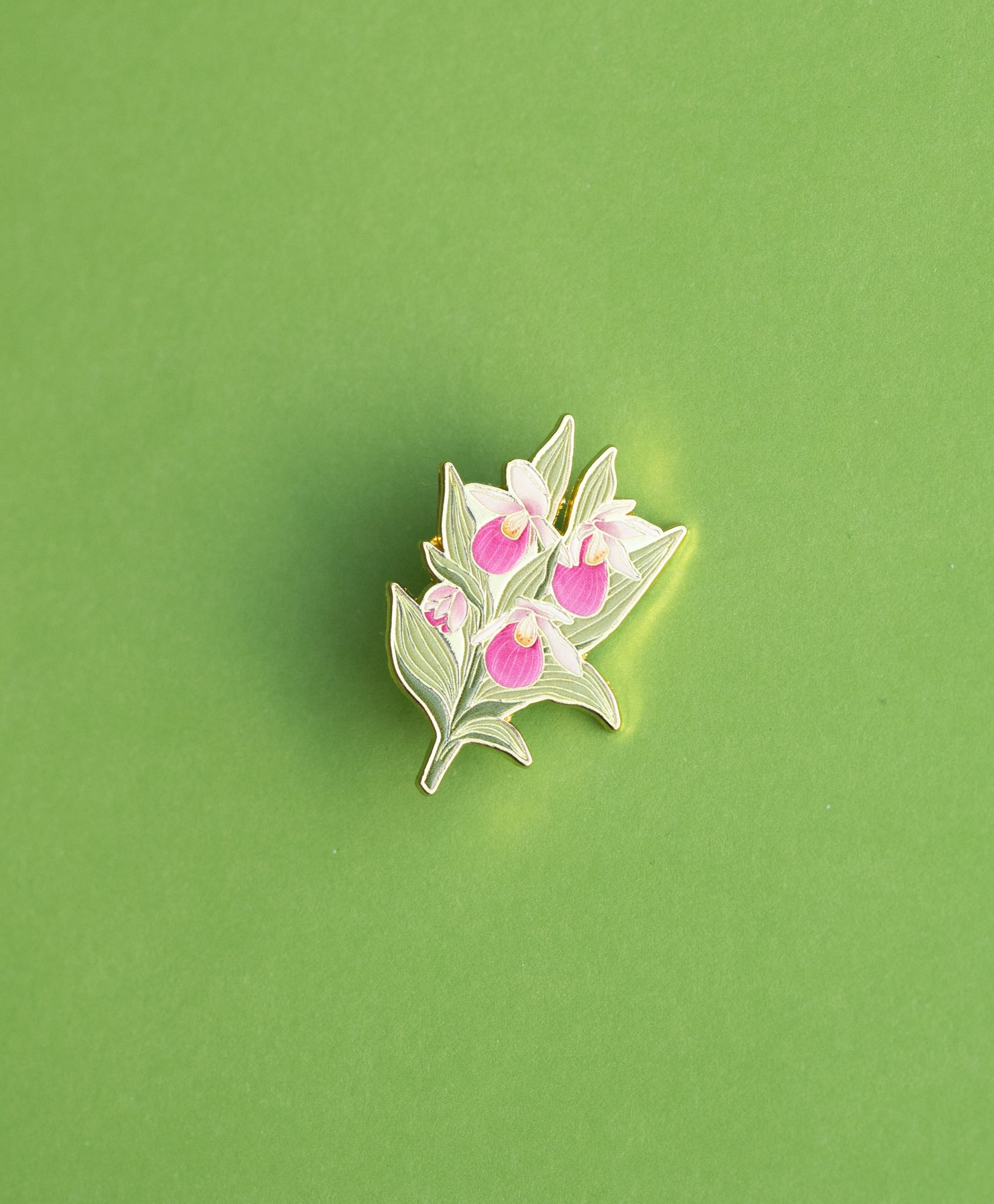 This is a detailed hard enamel pin made from my original “Showy Lady's Slippers” gouache and watercolor painting. Features one pin post and a tight fitting rubber backing.