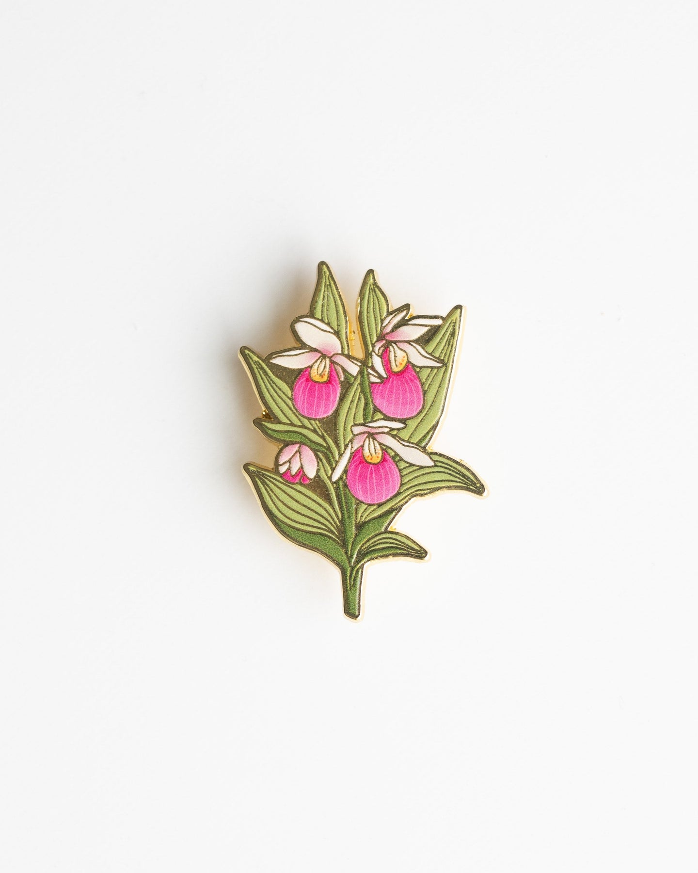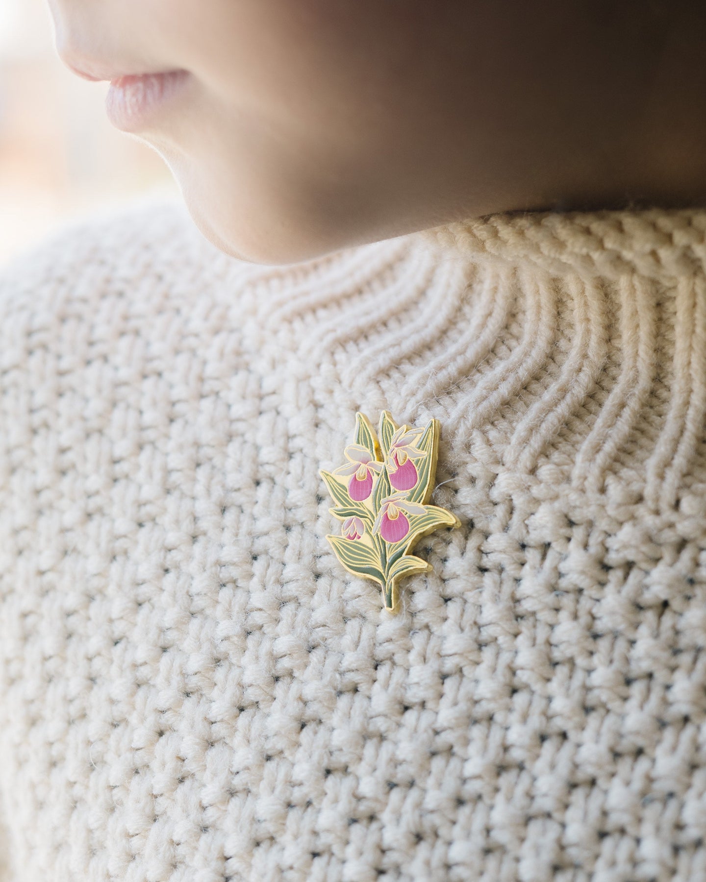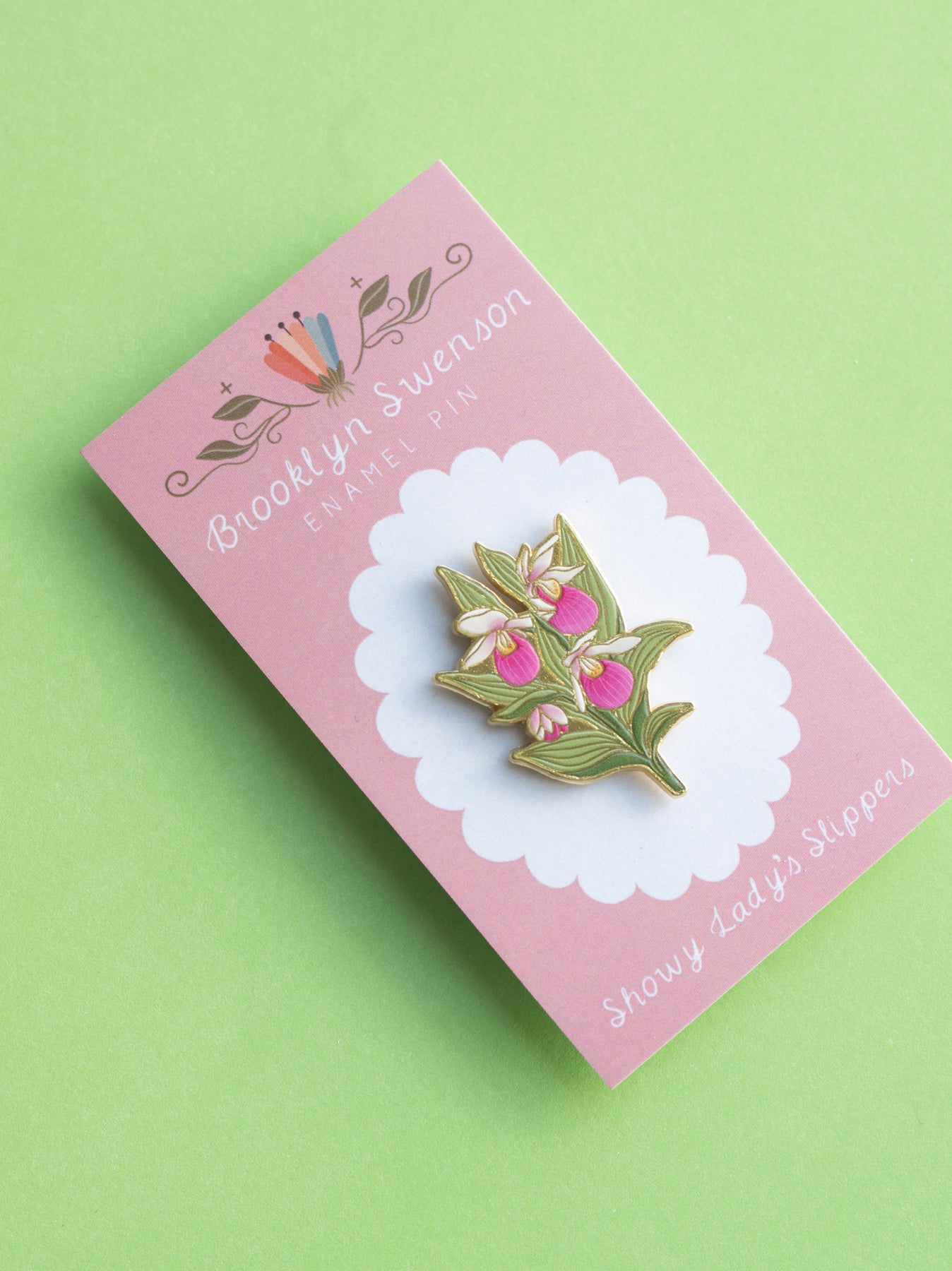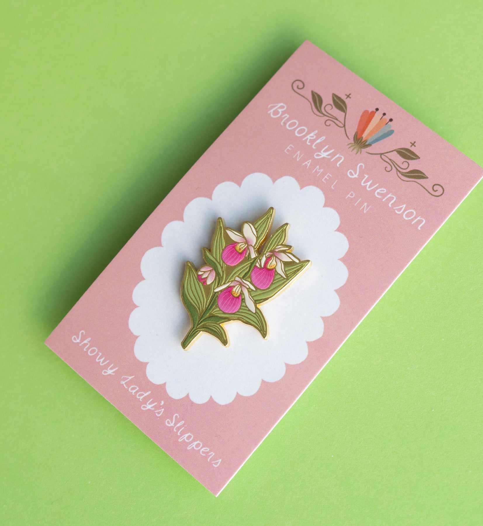 This is a detailed hard enamel pin made from my original “Showy Lady's Slippers” gouache and watercolor painting. Features one pin post and a tight fitting rubber backing.