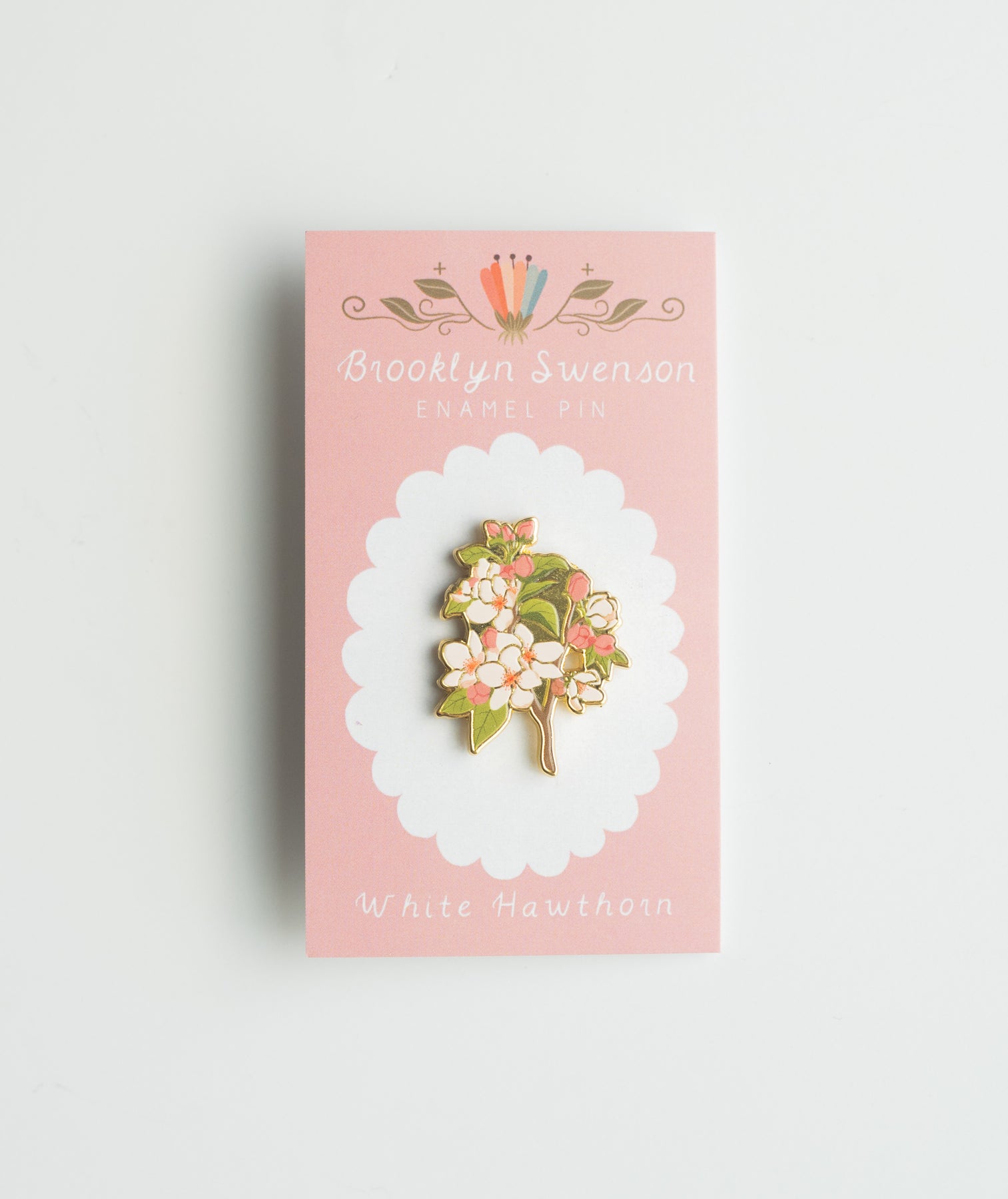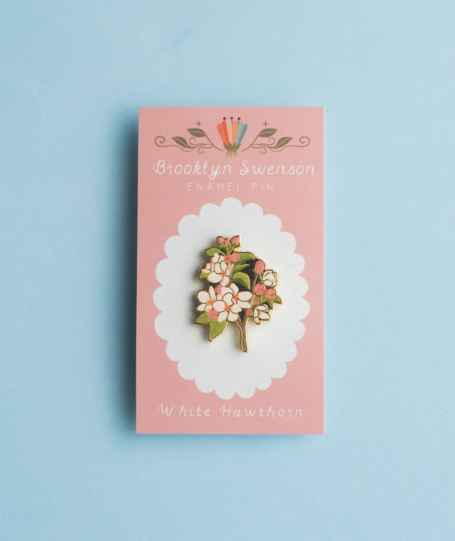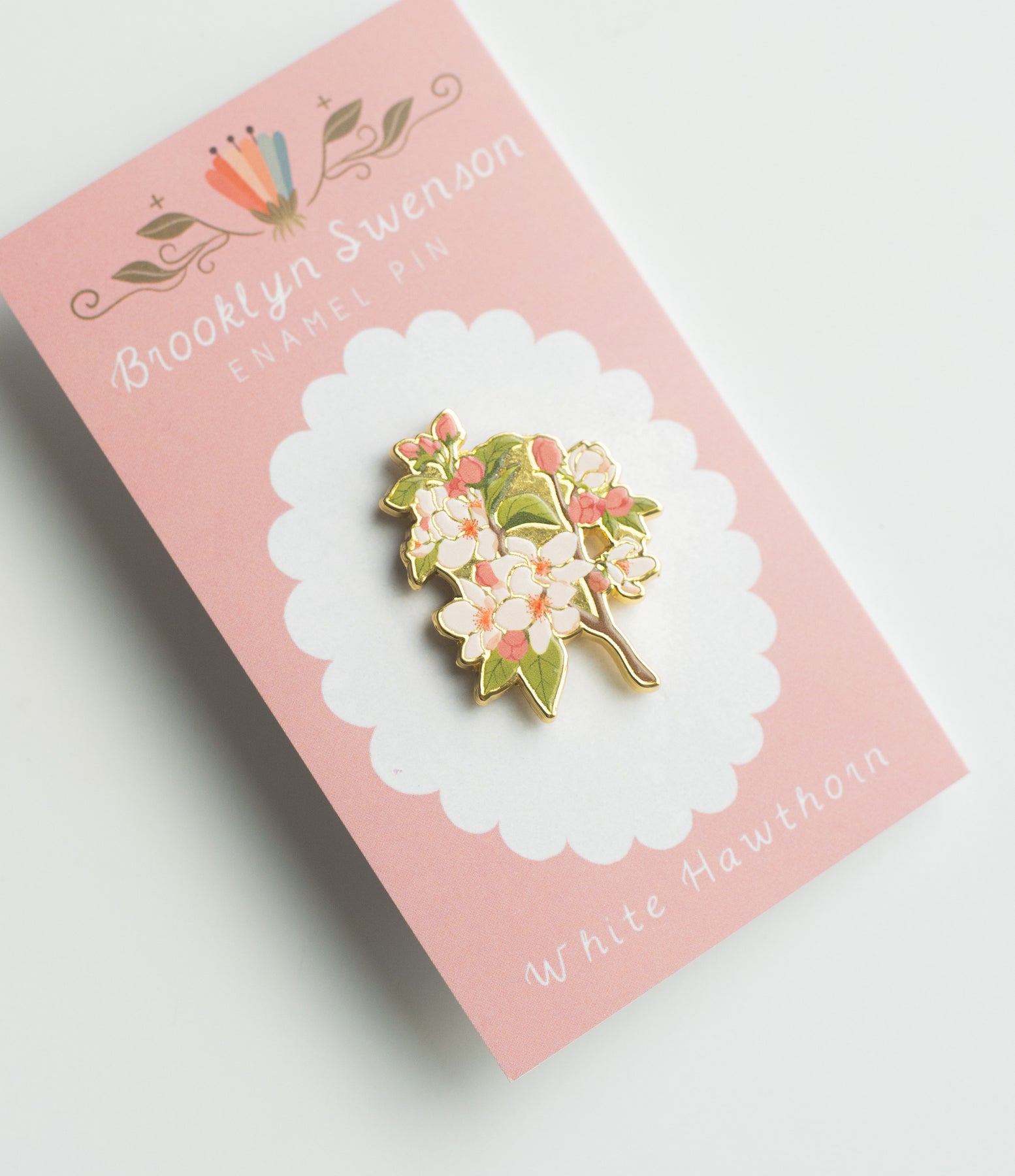 This is a detailed hard enamel pin made from my original “White Hawthorn” gouache and watercolor painting. Features one pin post and a tight fitting rubber backing.