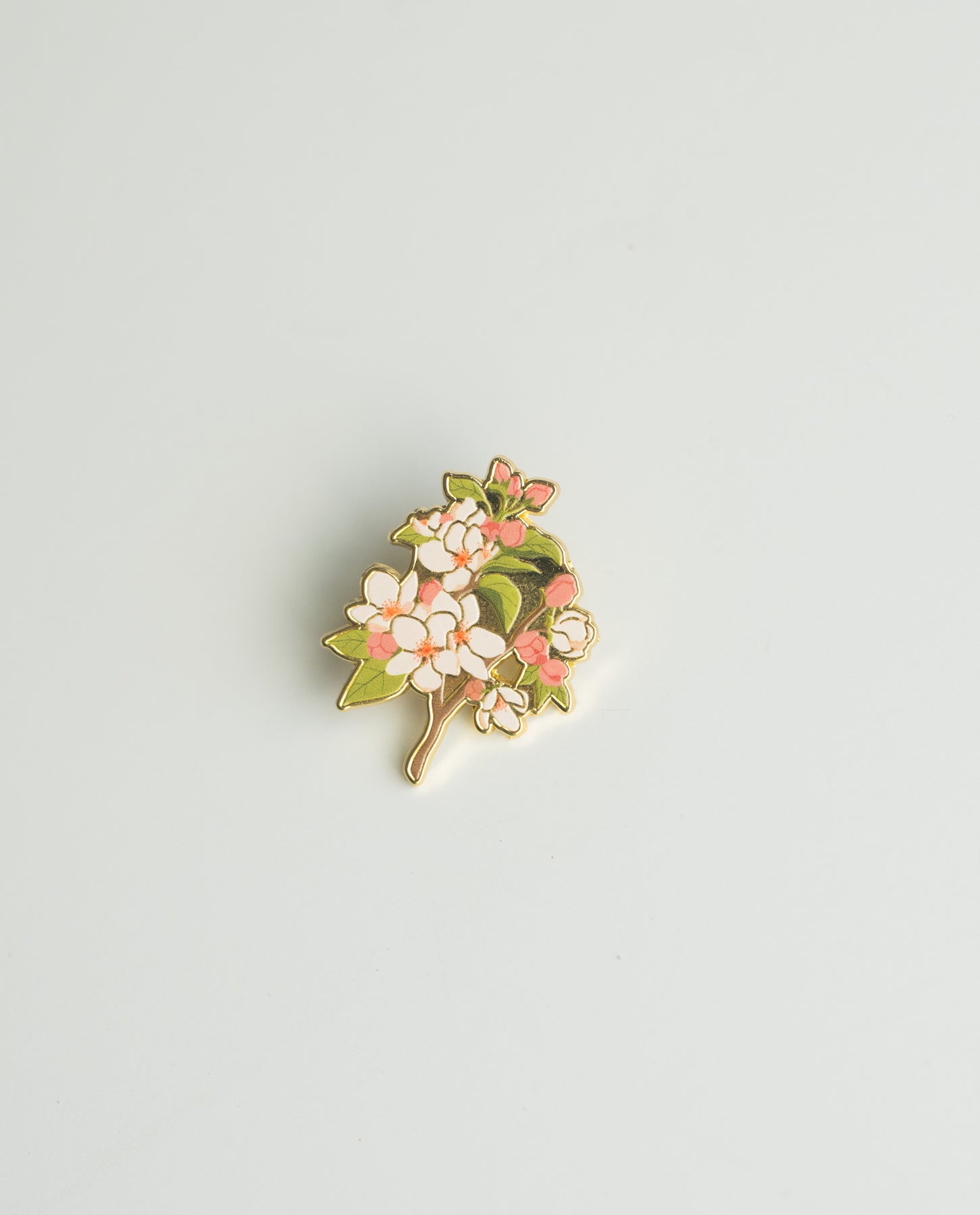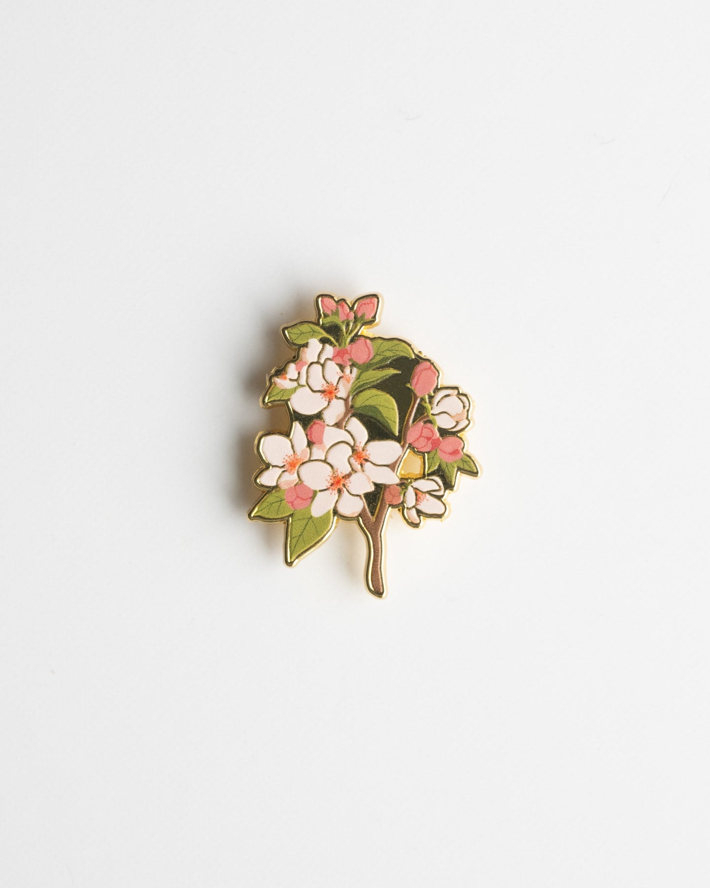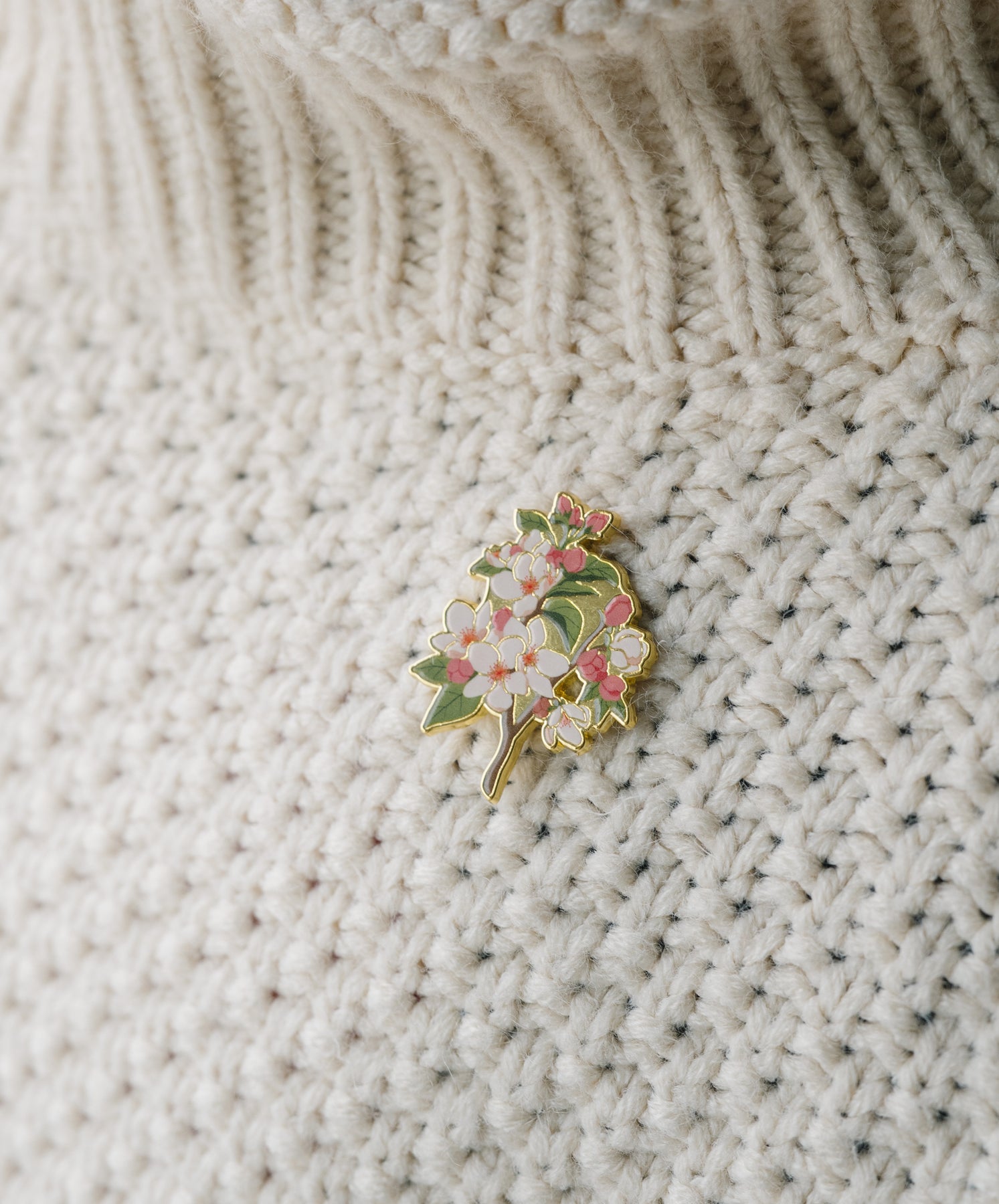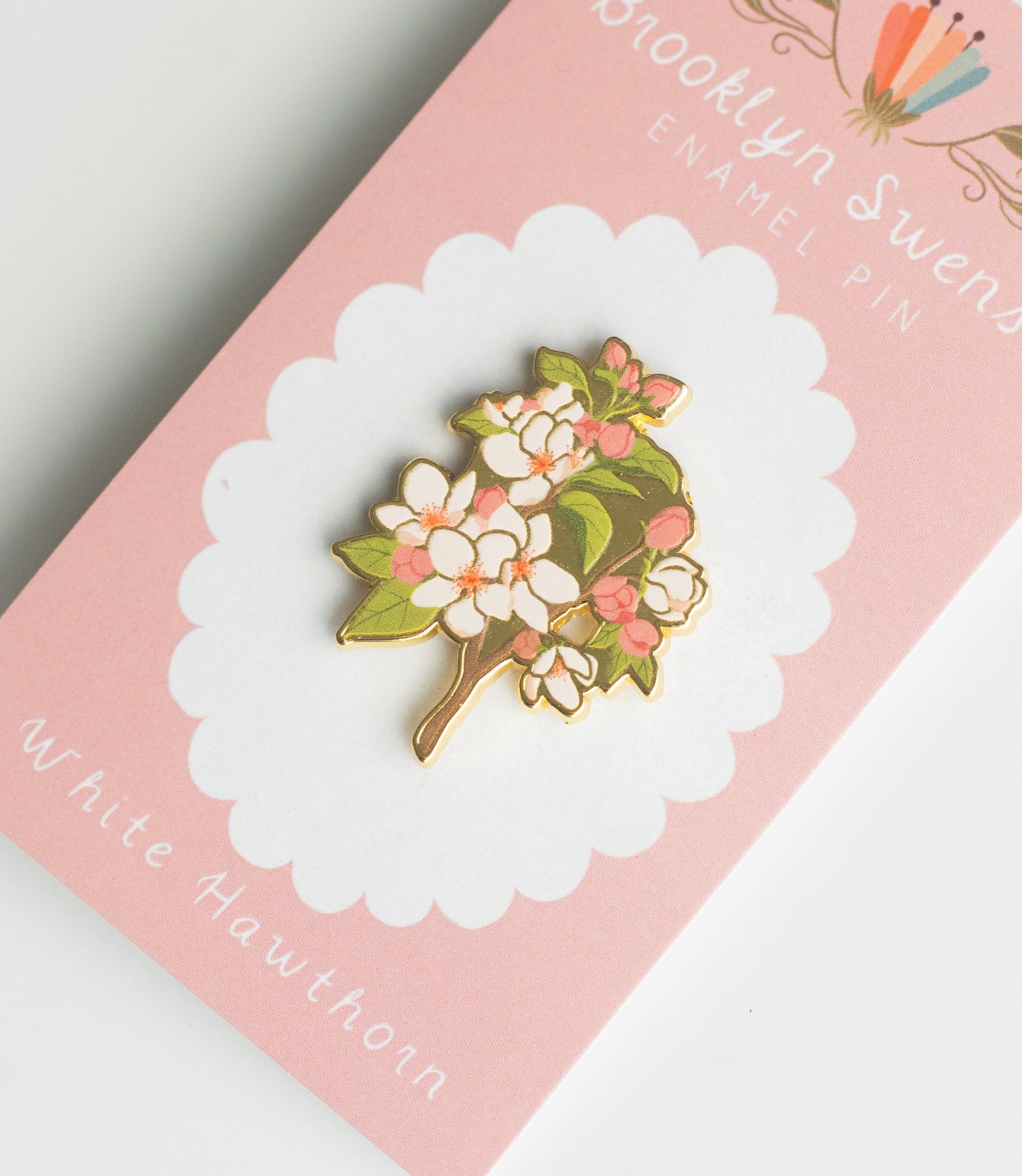 This is a detailed hard enamel pin made from my original “White Hawthorn” gouache and watercolor painting. Features one pin post and a tight fitting rubber backing.