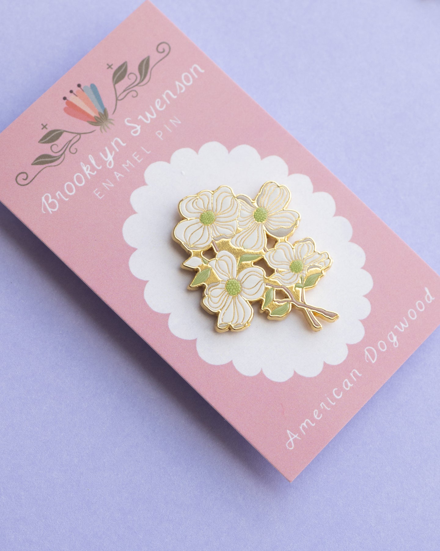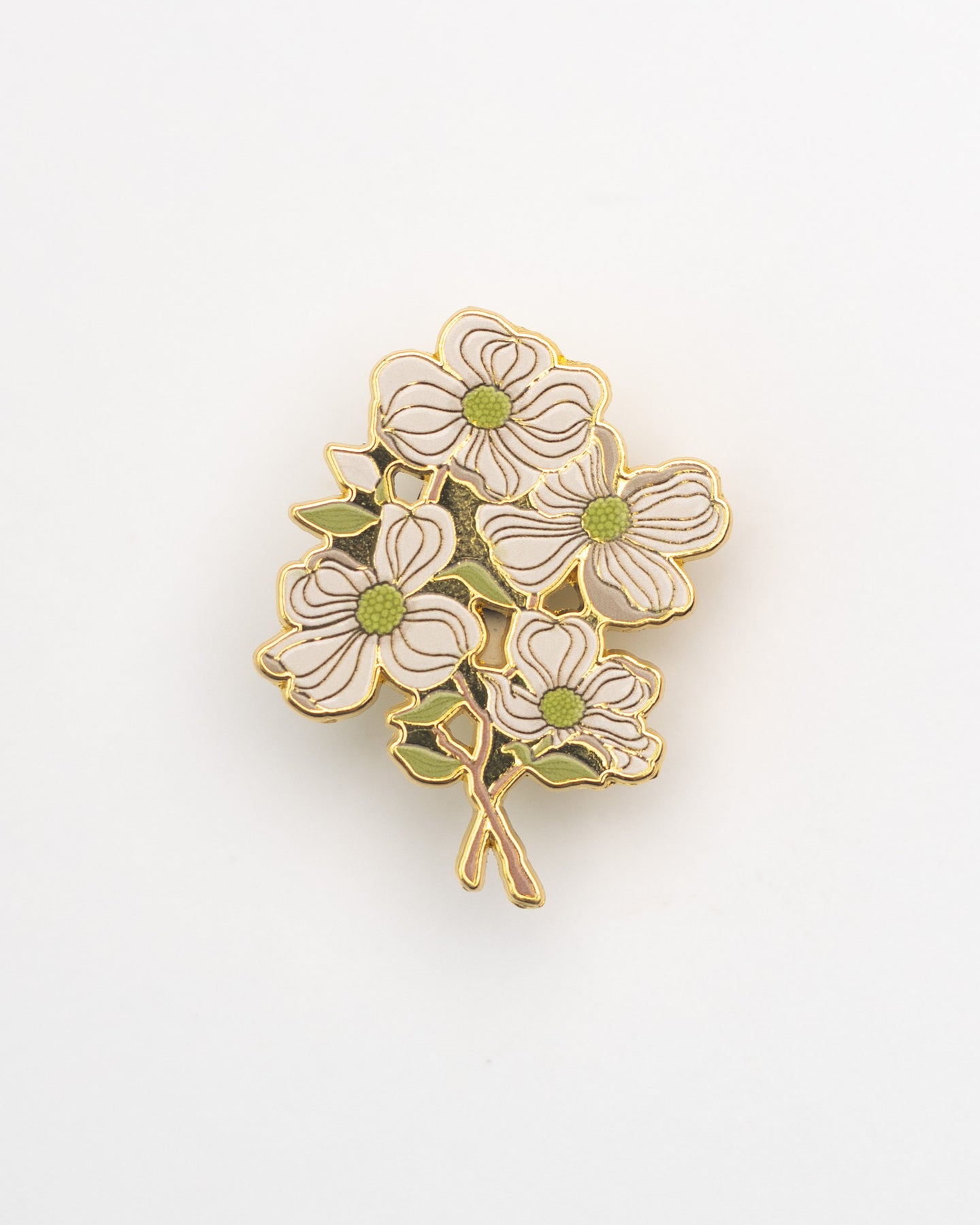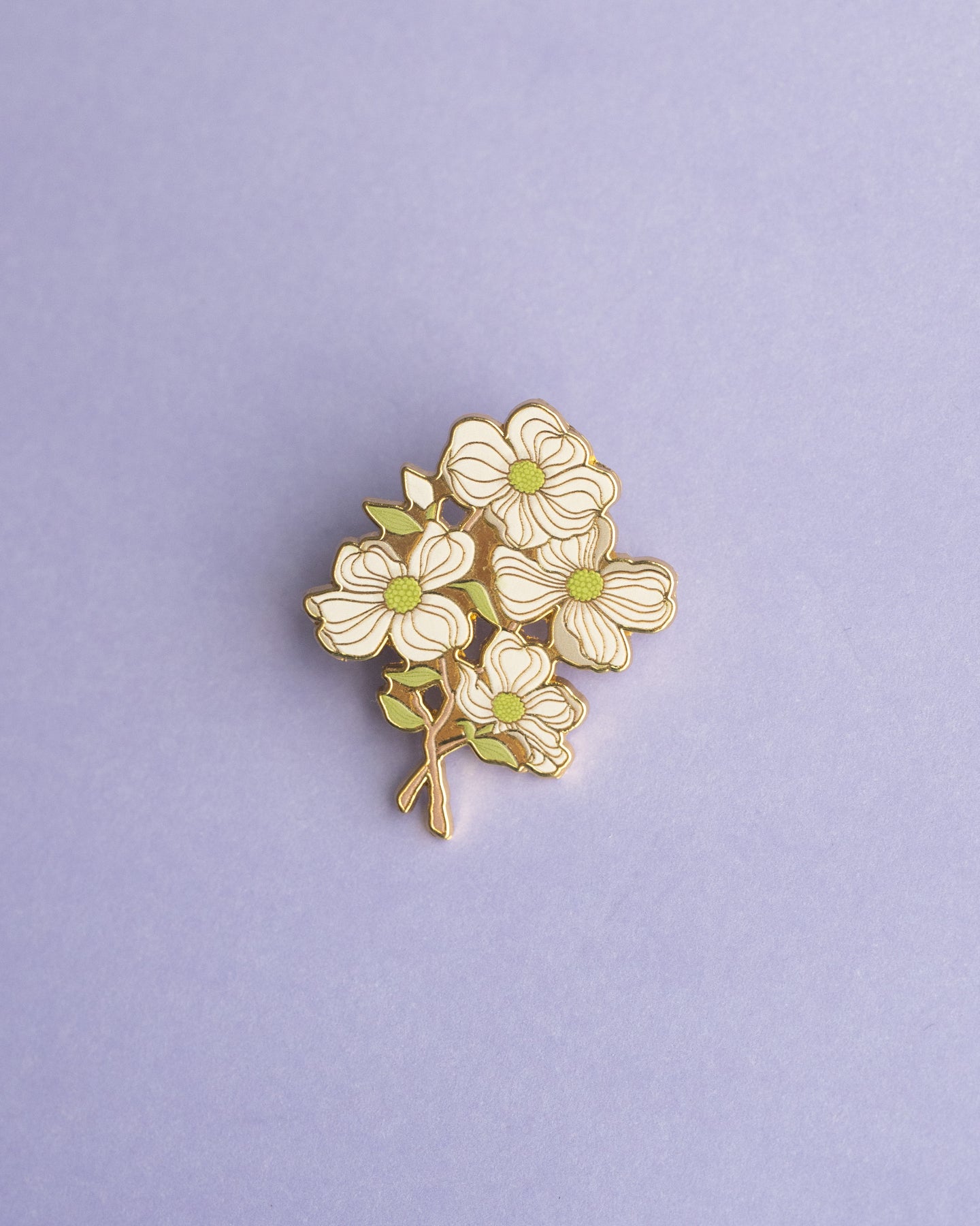 This is a detailed hard enamel pin made from my original “Flowering Dogwood” gouache and watercolor painting. Features one pin post and a tight fitting rubber backing.