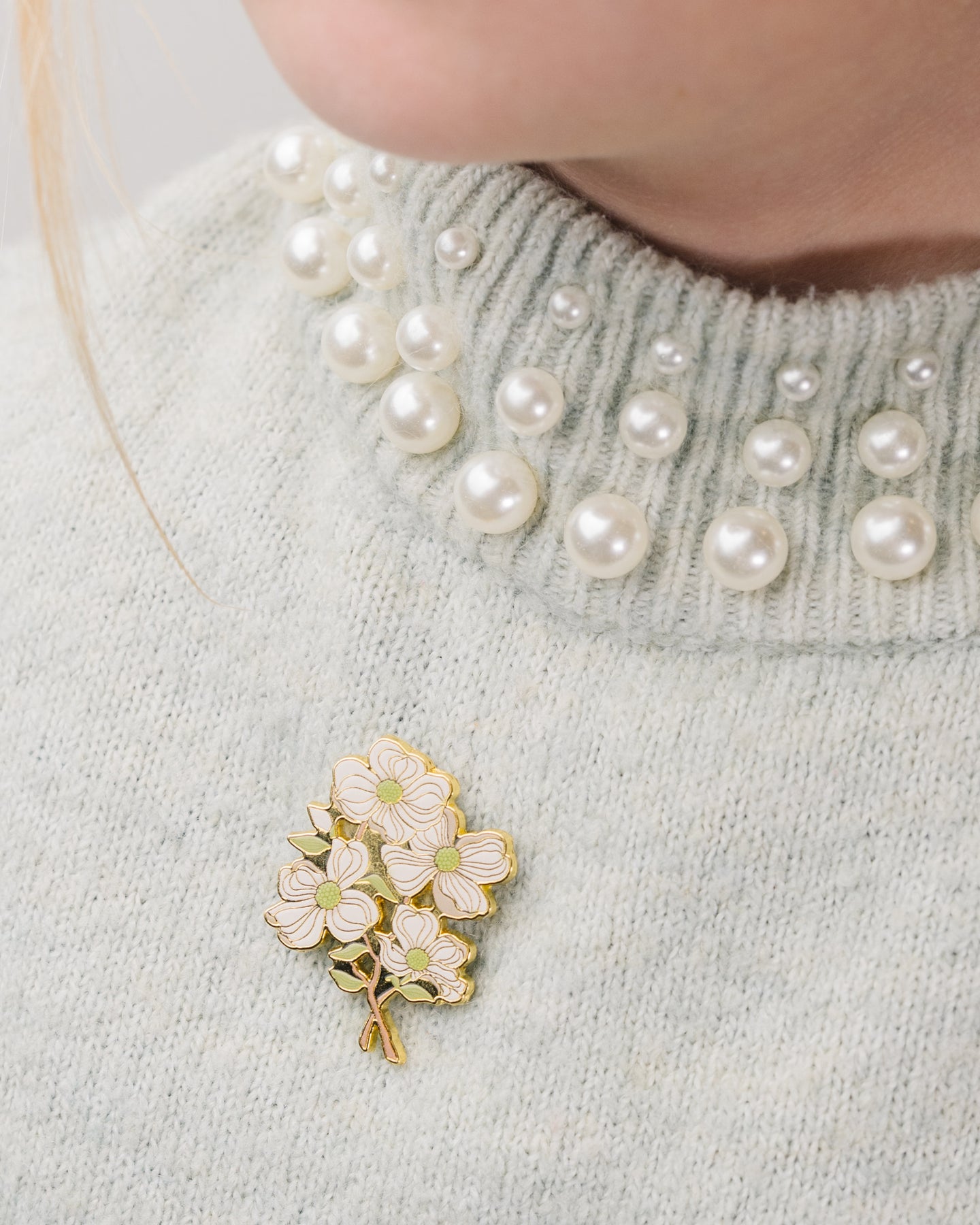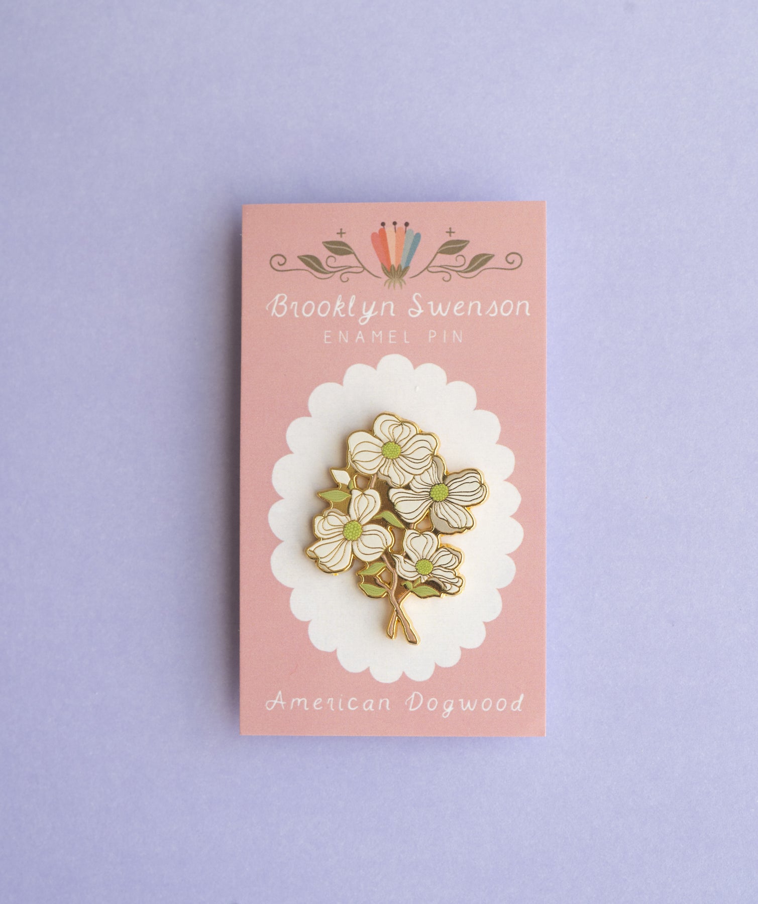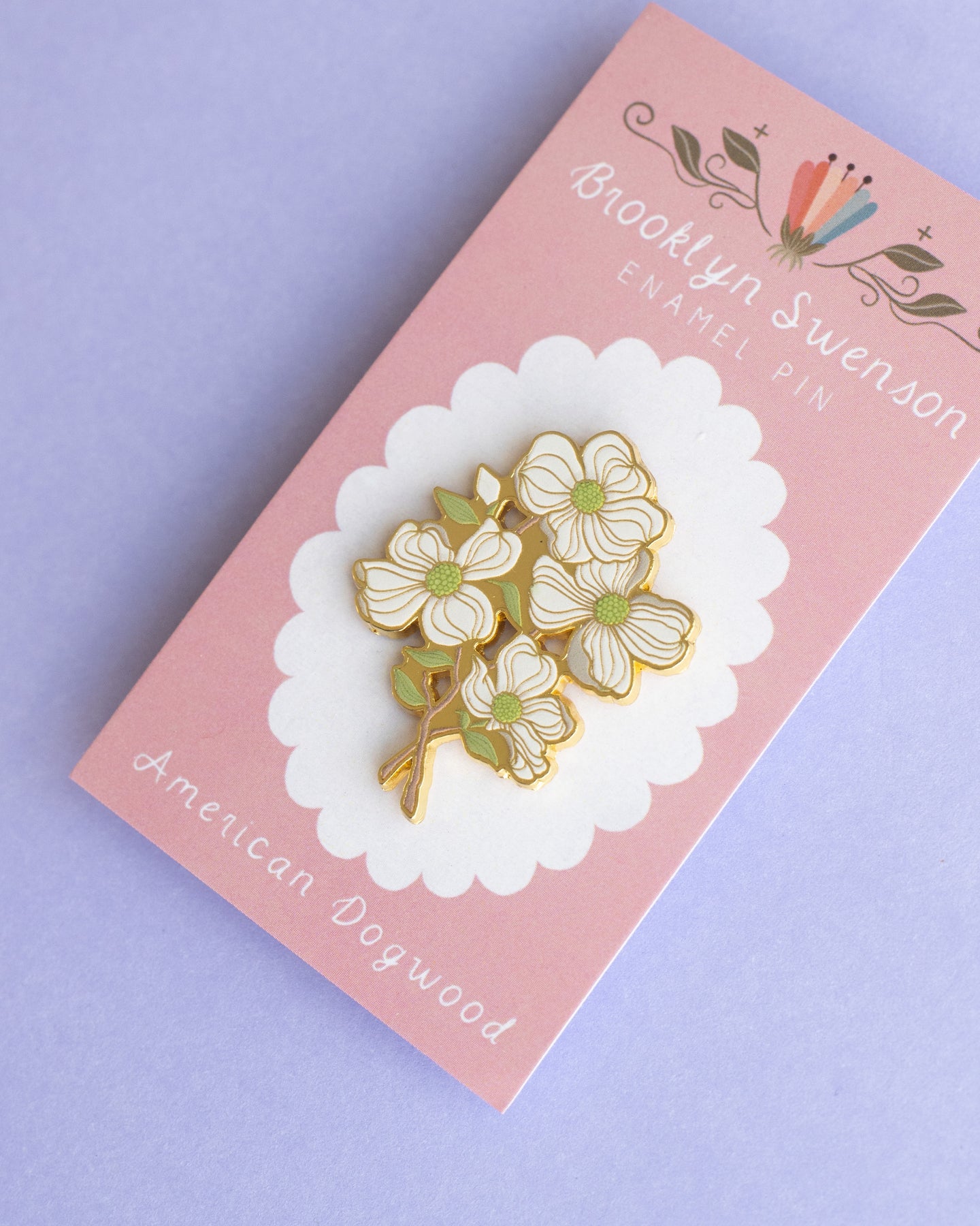 This is a detailed hard enamel pin made from my original “Flowering Dogwood” gouache and watercolor painting. Features one pin post and a tight fitting rubber backing.