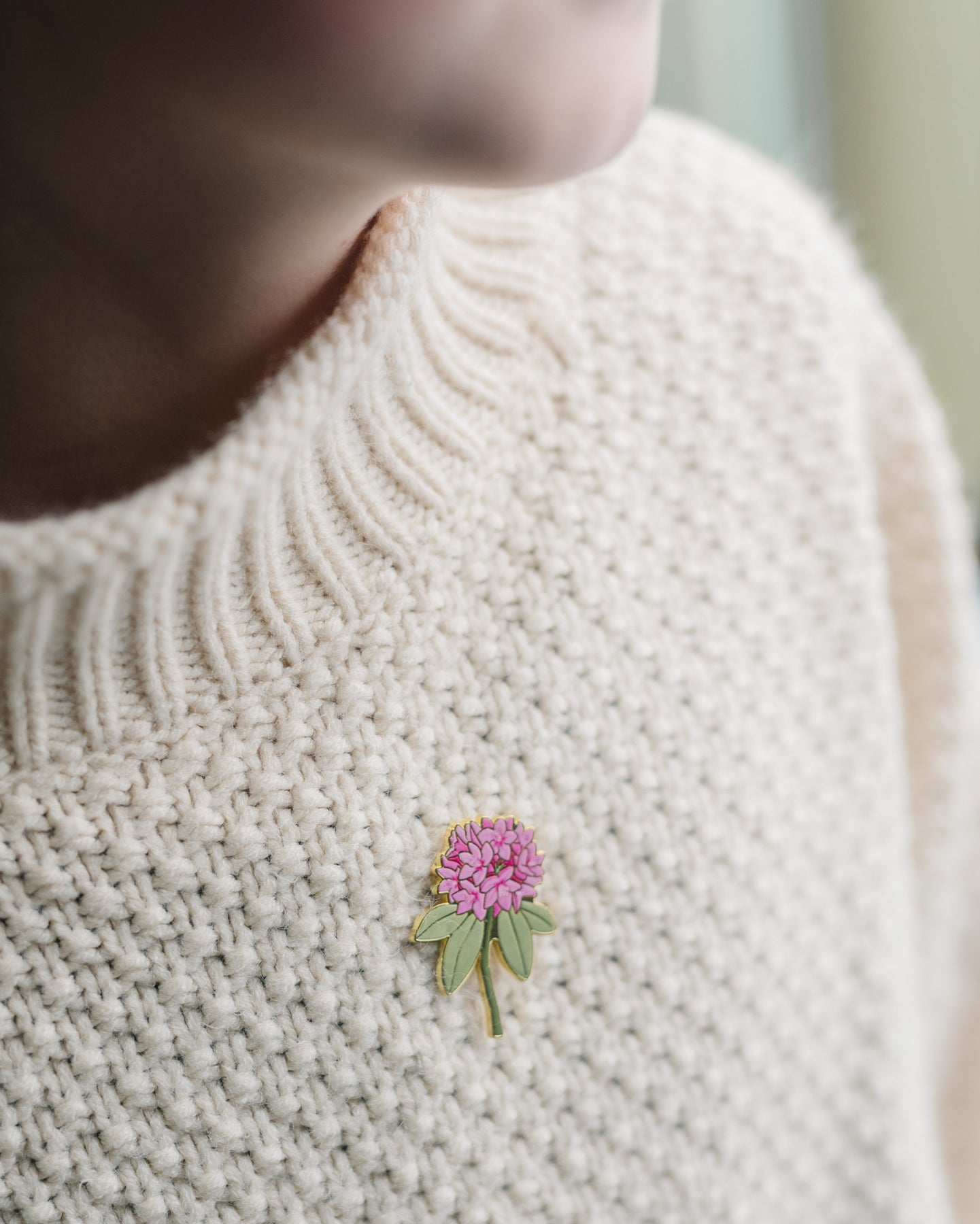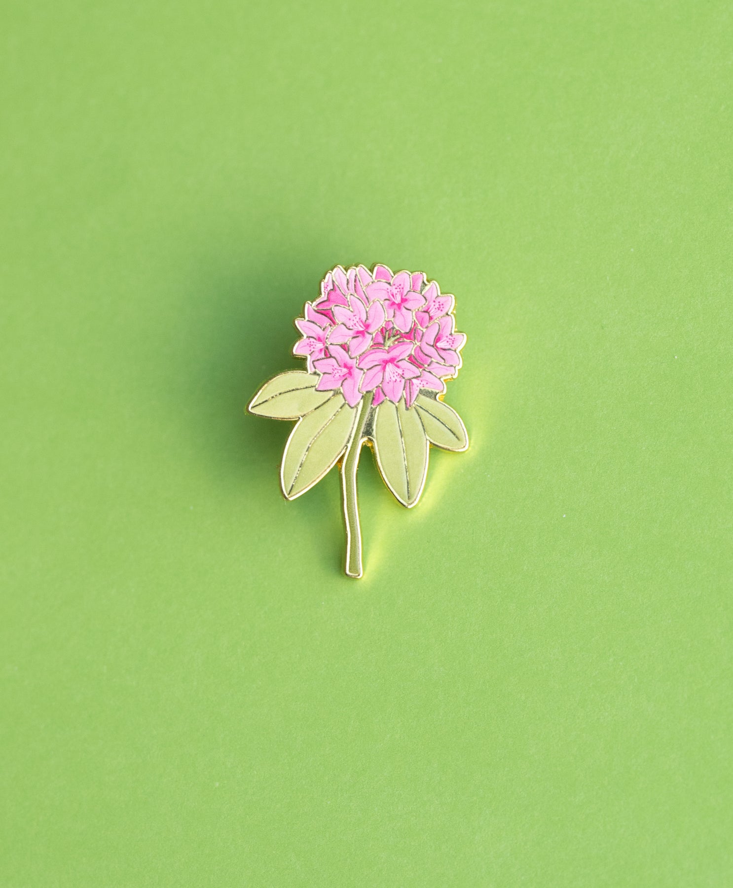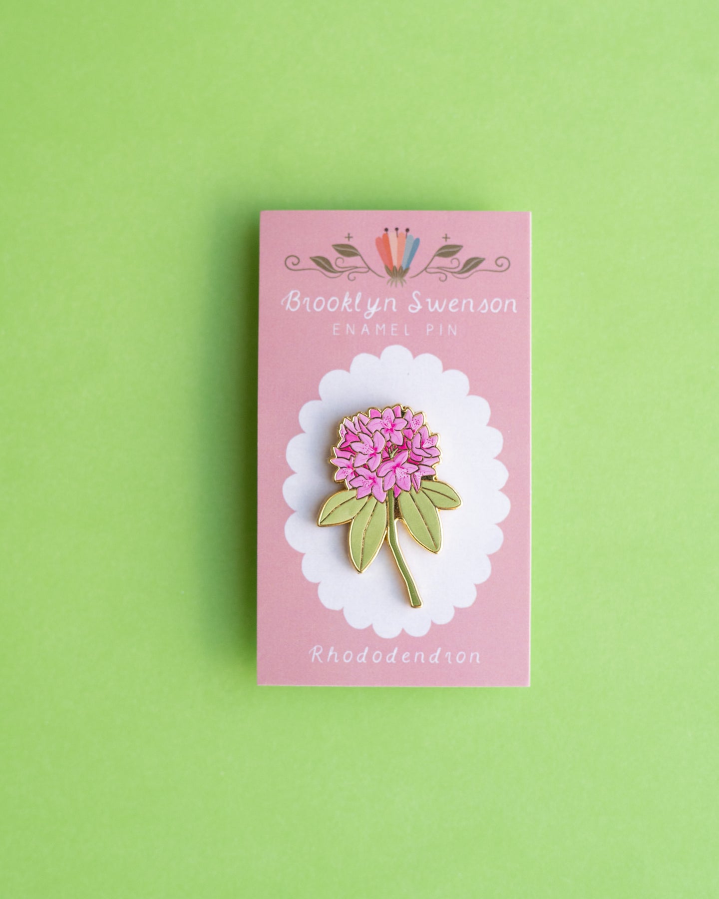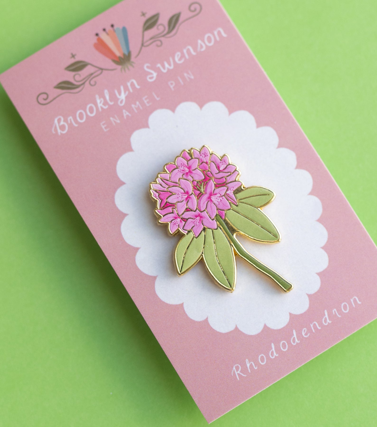 This is a detailed hard enamel pin made from my original “Rhododendron” gouache and watercolor painting. Features one pin post and a tight fitting rubber backing.