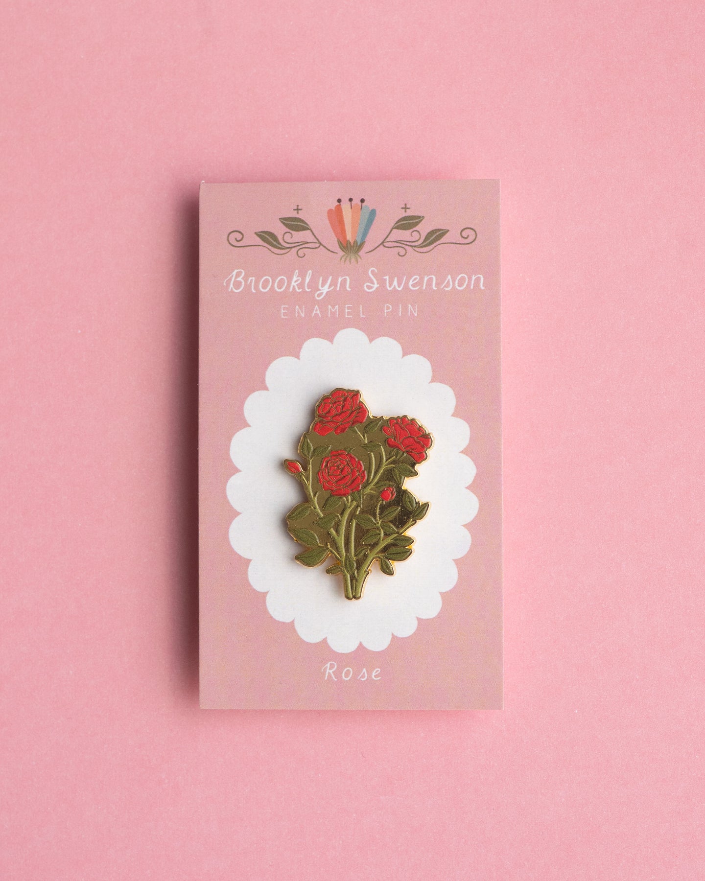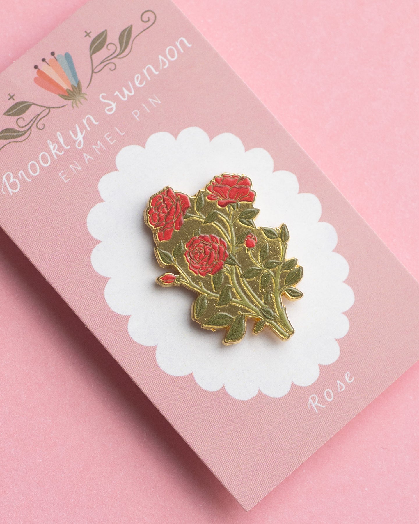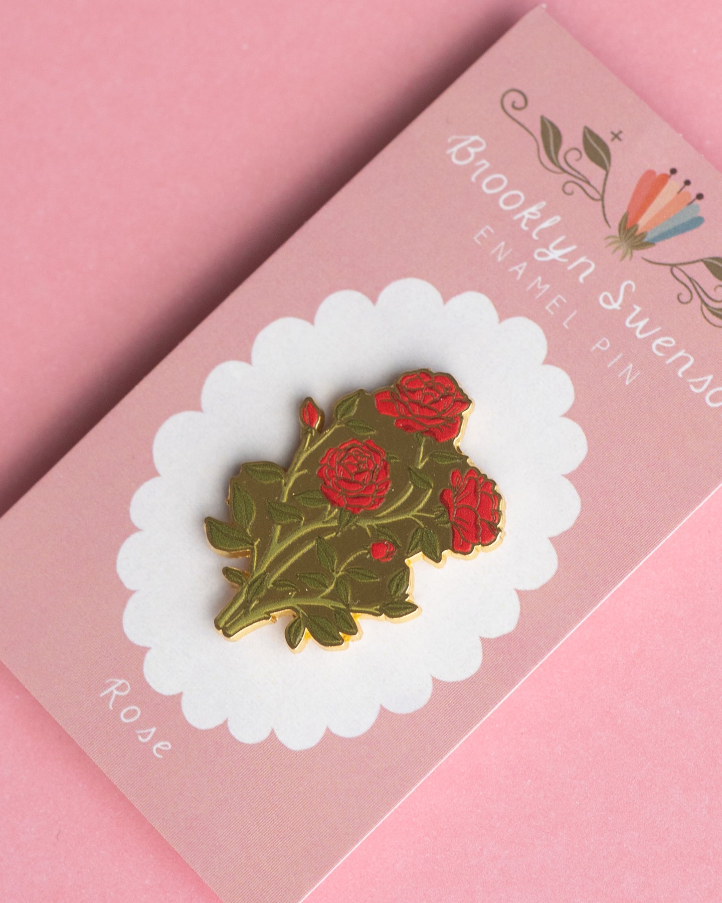 This is a detailed hard enamel pin made from my original “Rose” gouache and watercolor painting. Features one pin post and a tight fitting rubber backing.